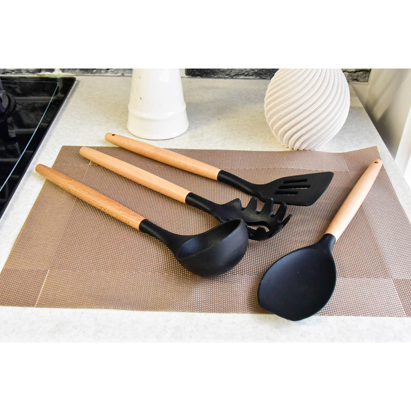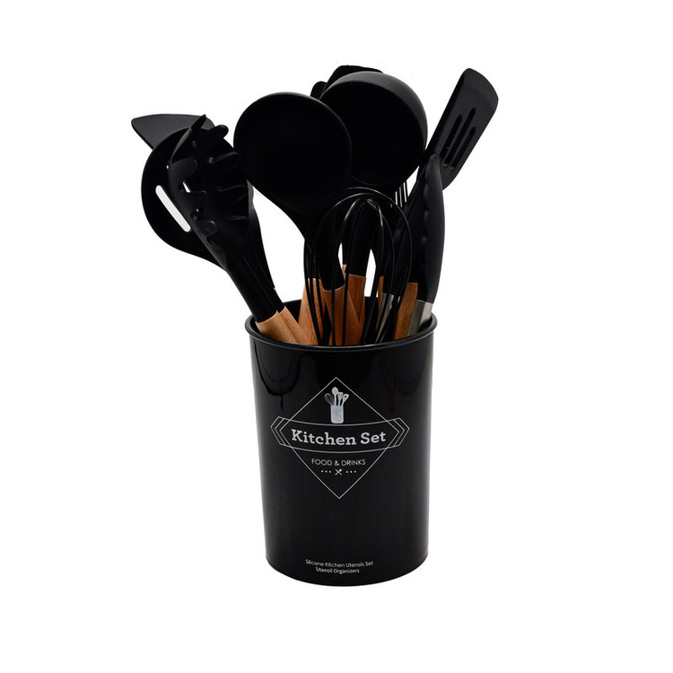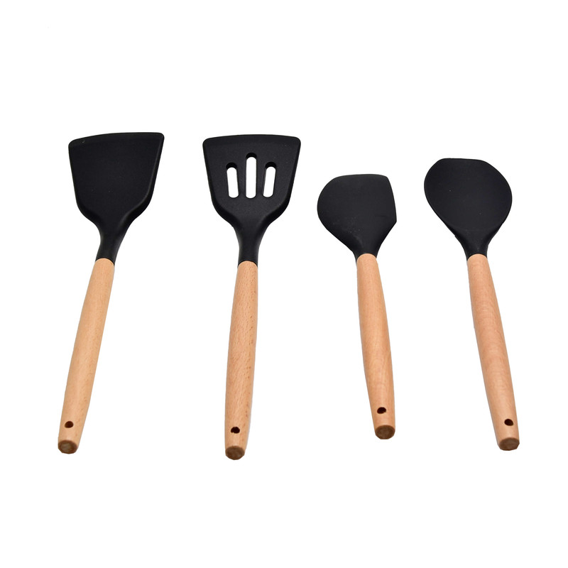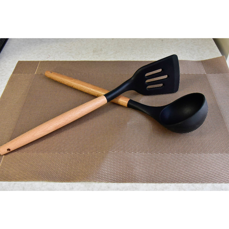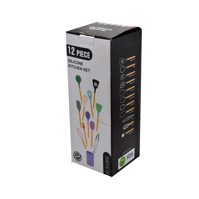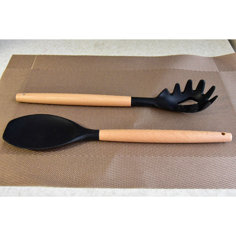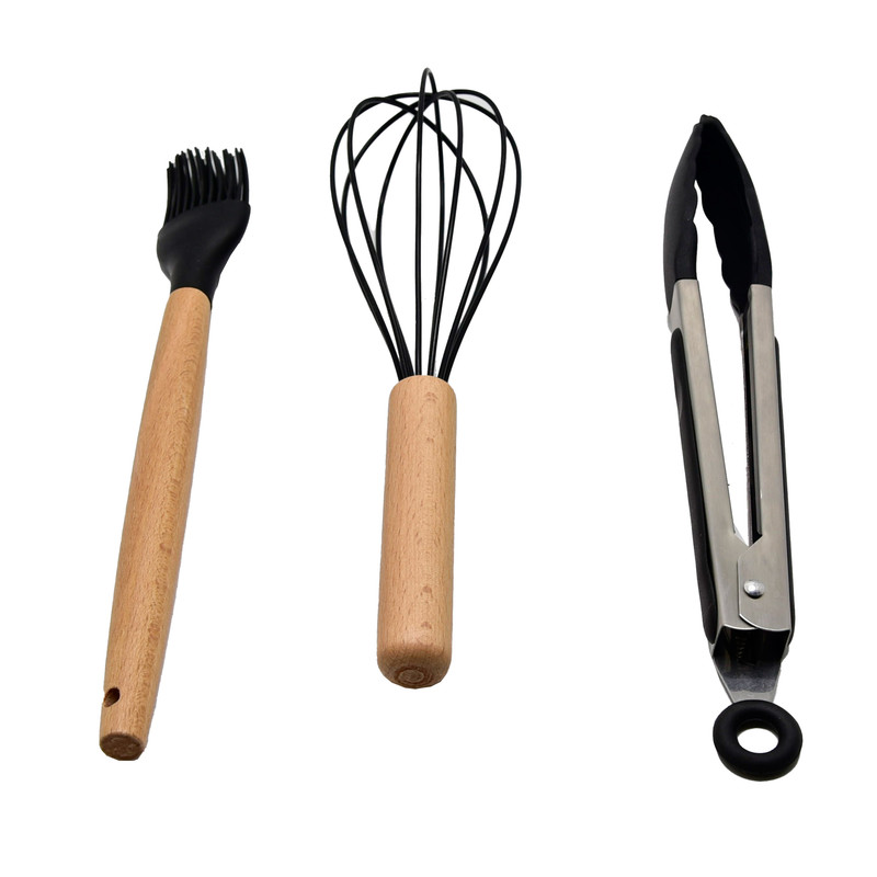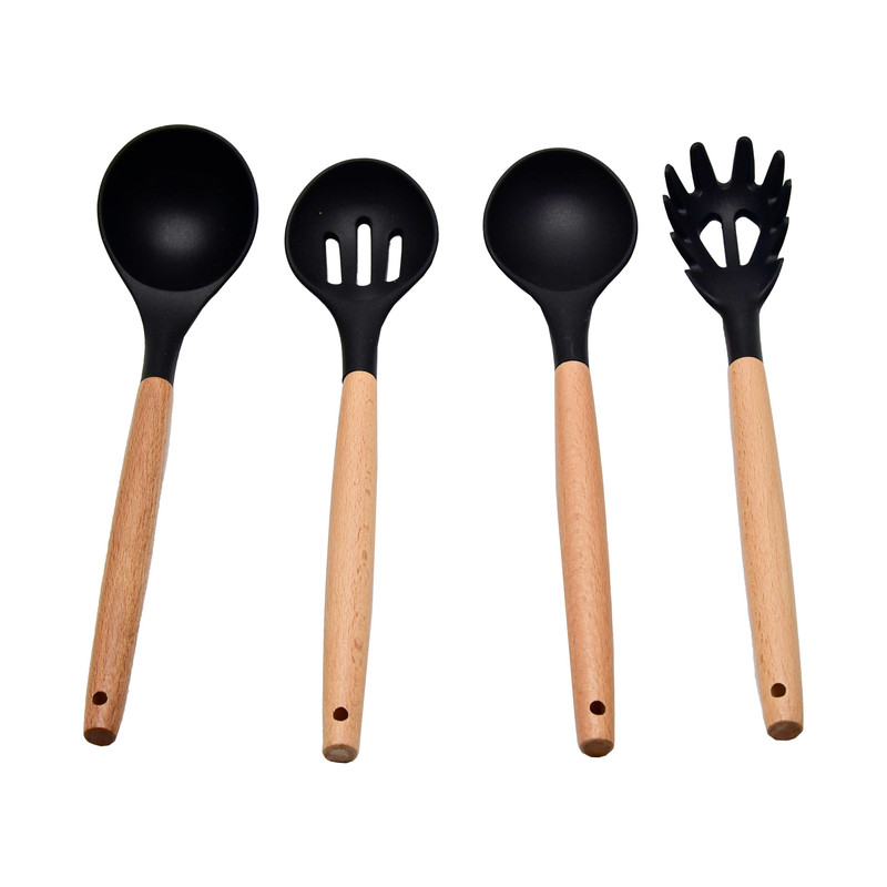 دارای اقلام: کفگیر پختوپز چنگال پختوپز ملاقه همزن کفگیر کیک قاشق سالاد چنگال سالاد قاشق پختوپز انبر دارای دسته چوبی بامبو سر سیلیکونی نسوز طراحی اروپایی رنگبندی متنوع
