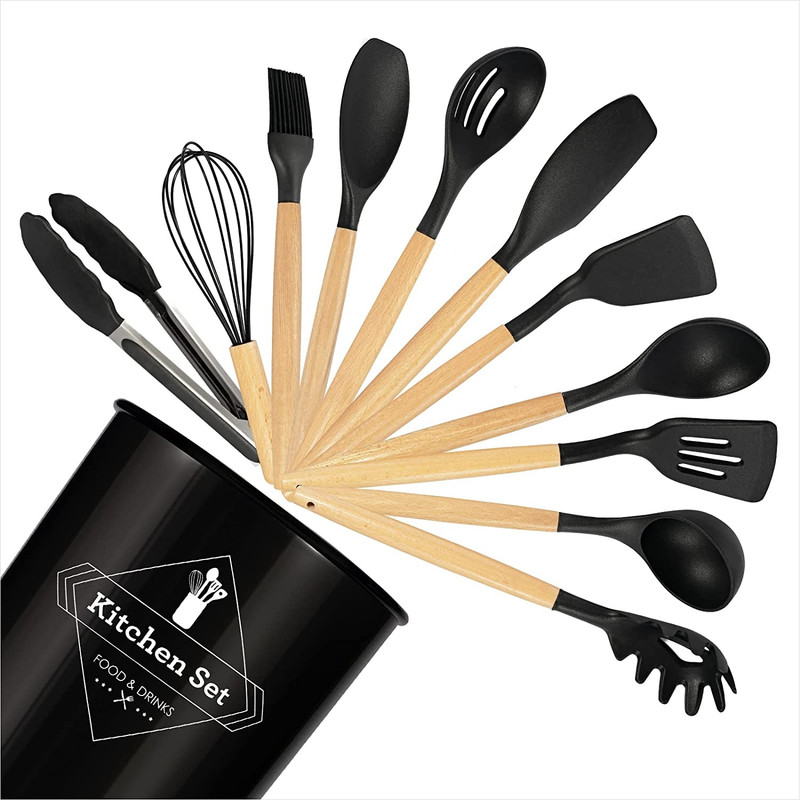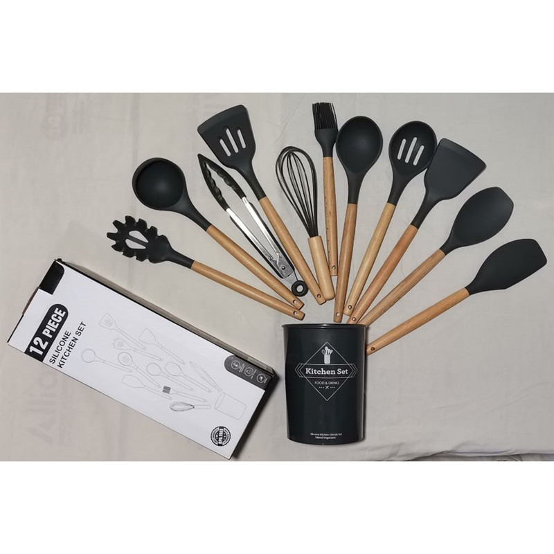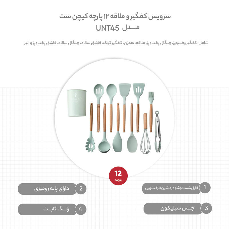 شامل: کفگیر پختوپز , چنگال پختوپز , ملاقه , همزن , کفگیر کیک , قاشق سالاد , چنگال سالاد , قاشق پختوپز , انبر