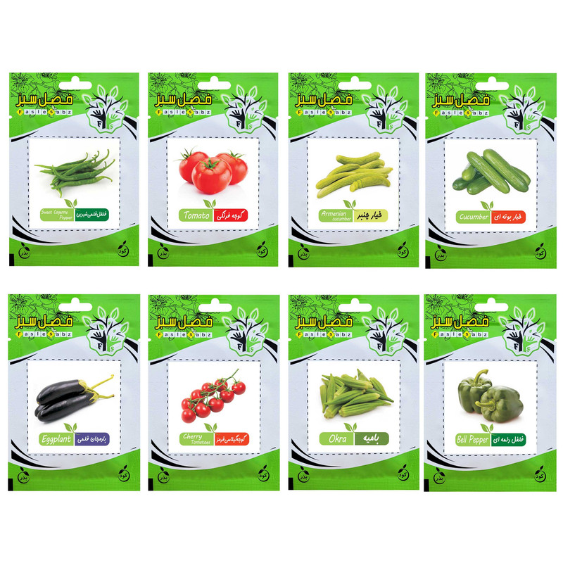 بسته بندی مناسب (مقاوم در برابر نور و رطوبت) مقرون به صرفه درصد جوانه زنی بالا شامل بذر های : خیار بوته ای ، خیار چنبر ، گوجه فرنگی ، فلفل قلمی شیرین ، فلفل دلمه ای ، بامیه ، کدو سبز و بادمجان قلمی