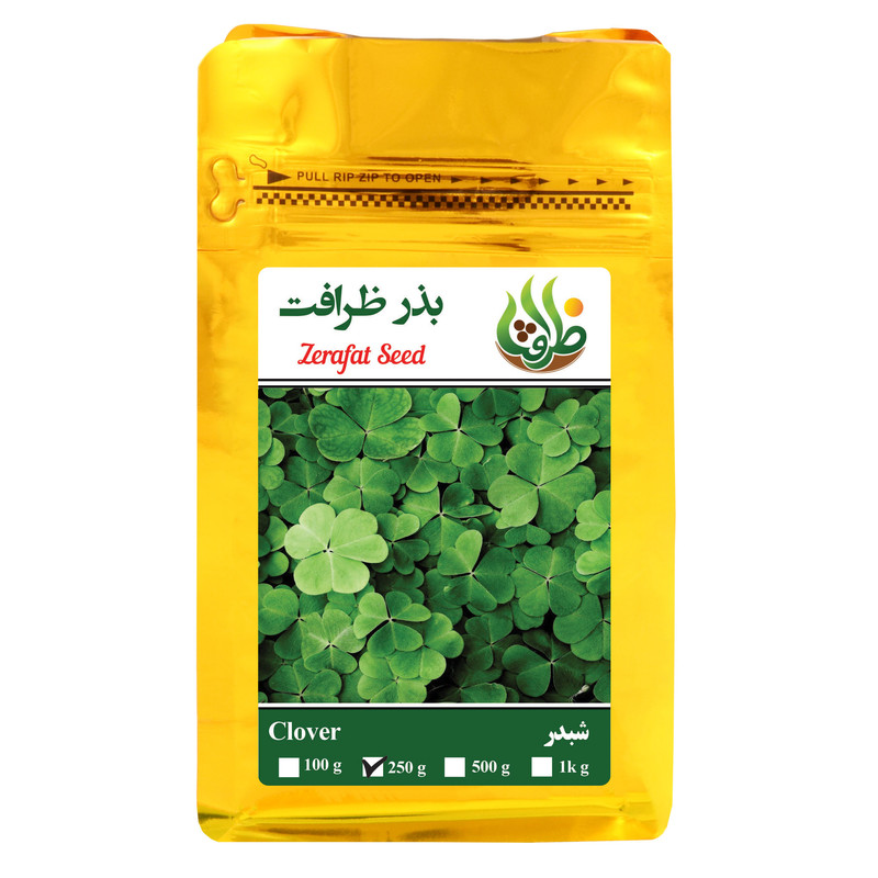 حاوی 250 گرم بذر شبدر بسته بندی مناسب (مقاوم در برابر نور و رطوبت) مقرون به صرفه درصد جوانه زنی بالا