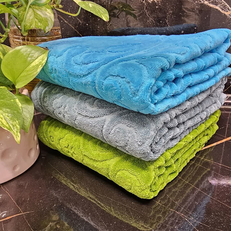 سایز 45*97 کاملا ضخیم و آبگیر . عدم پرز و رنگ دهی .نوع بافت : مخمل و مدل ساده گل برجسته