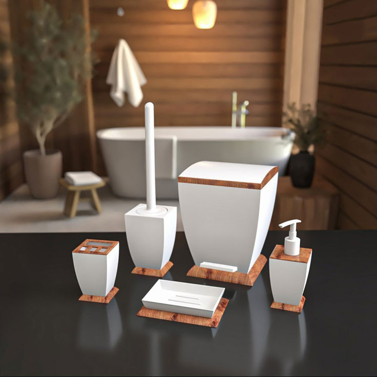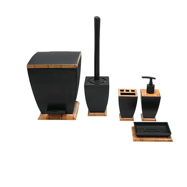 سرویس 5 پارچه آوا طرح چوب، از جنس پلاستیک است. این محصول شامل سطل، فرچه، جا مایع، جا صابون و جا مسواک می باشد. درب سطل این ست به صورت پدالی باز می شود.