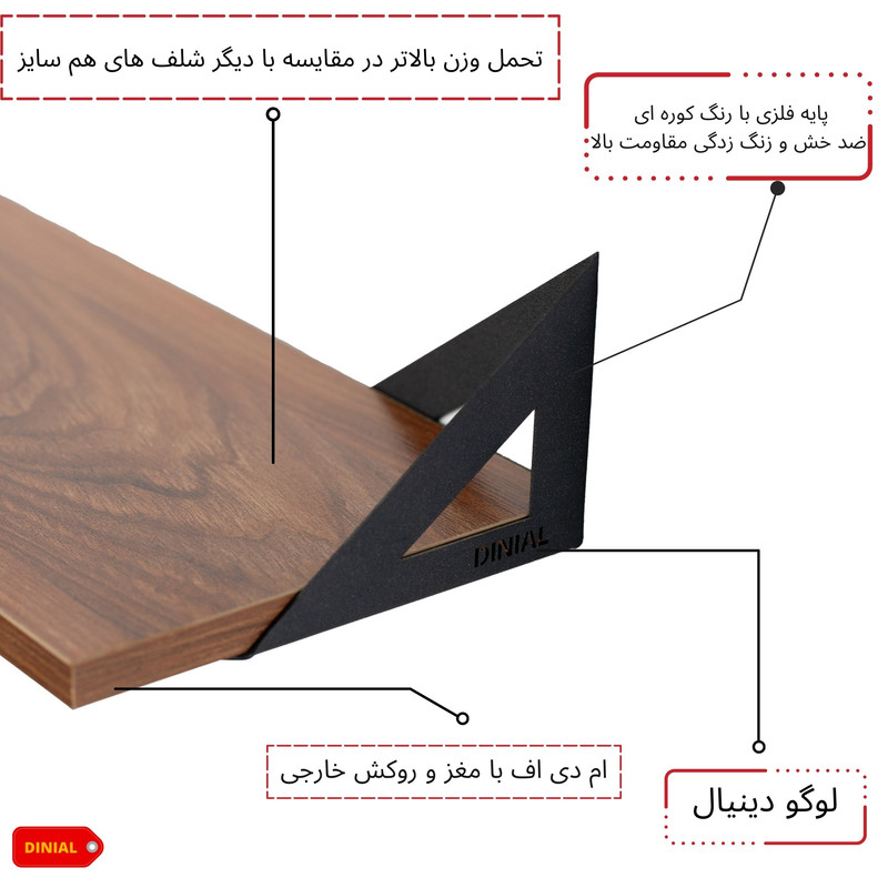 شلف دیواری دینیال ساخته شده از ام دی اف با مغز و روکش خارجی , پایه های فلزی این محصول با رنگ کوره ای نقش بسیار مهمی در کیفیت و مقاومت محصول دارد