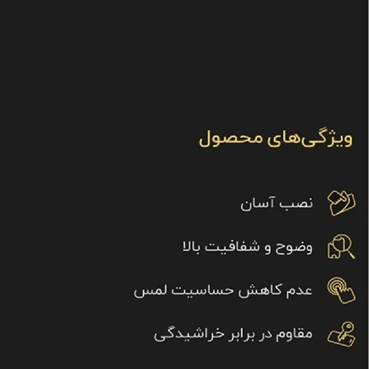 ویژگیها: 9H , جلوگیری از انعکاس نور , قابلیت نصب آسان , مقاوم در برابر چربی و اثرانگشت , مقاوم در برابر خط و خش , نصب بدون حباب
