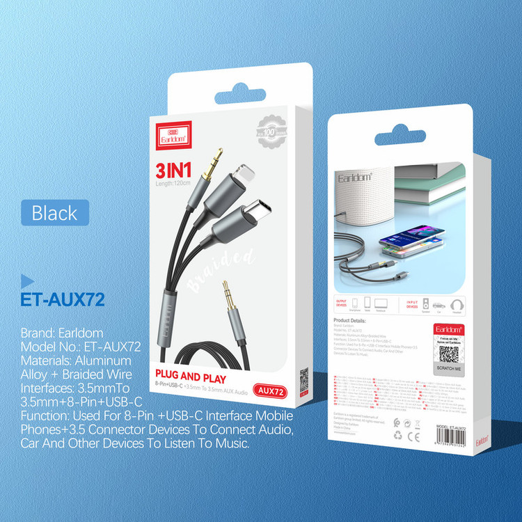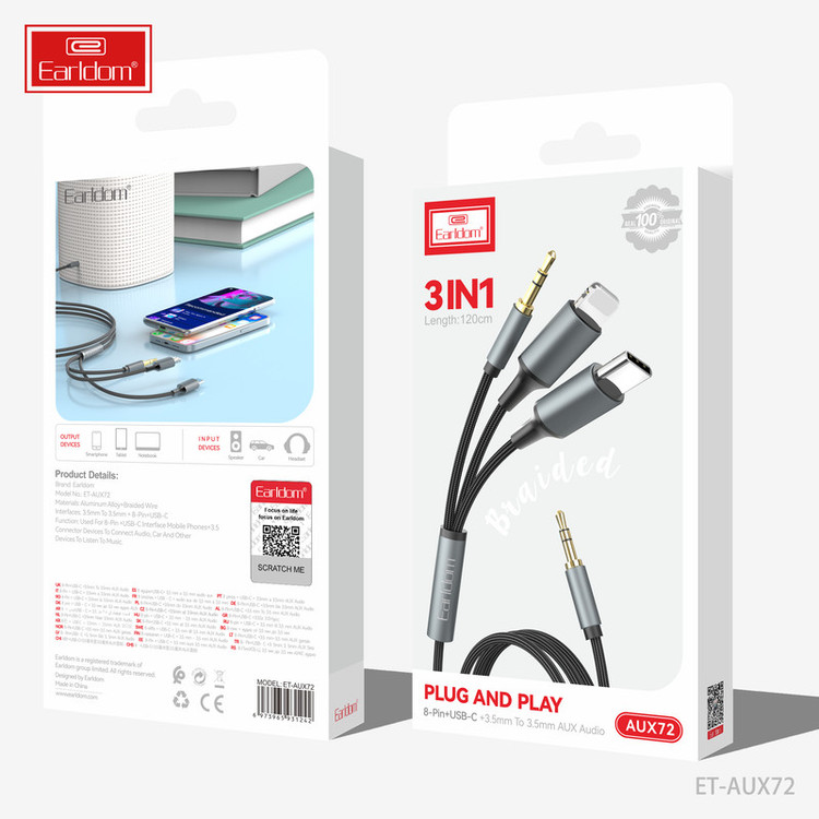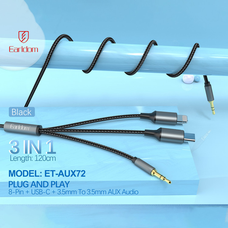 کابل تبدیل AUX به لایتنینگ / USB-C / AUX ارلدام مدل AUX72 طول 1.2 متر
