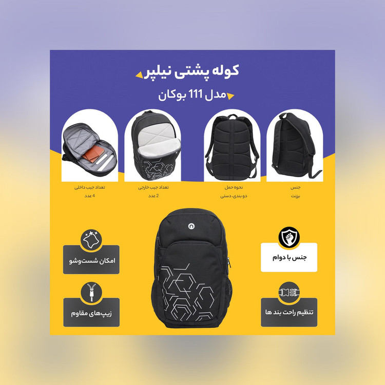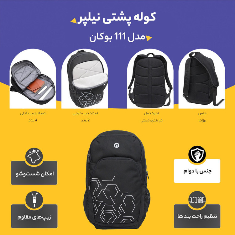 - ضدآب و قابل شست و شو - قابلیت حمل لپ تاپ - قابلیت حمل بطری - دارای زیپ های ریورز یا ضد آب - جنس آستر : پلی استر - دارای فضای طبی اسفنجی در پشت جهت جریان هوا و جلوگیری از تعریق - جنس کوله : برزنت ریز بافت جودون