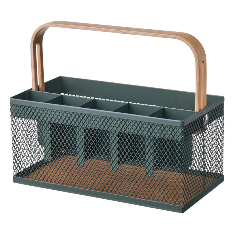 دسته: بامبو با لاک آکریلیک شفاف / بدنه: فولاد با پوشش پودری / کف: چوبپنبه (Cork) در پایین برای محافظت و استحکام./ نگهداری: با یک پارچه مرطوب پاک شود / ک بخش بزرگ + پنج بخش کوچک دارد برای قراردادن انواع قاشقها، چنگالها، دستمالها یا ابزار کوچک میز