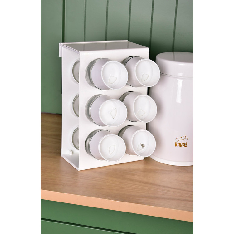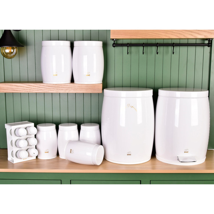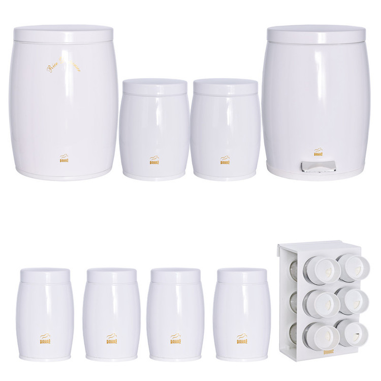 این ست شامل : 1 عدد سطل زباله ، 1 عدد سطل برنج ، 1 عدد سطل قند ، 1 عدد سطل شکر، 4 عدد جا حبوبات ، جا ادویه 6 پارچه ، 1 عدد استند