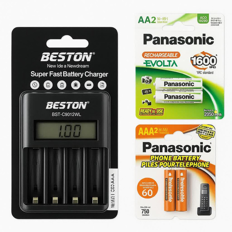 شارژر باتری بستون دیجیتالی با قابلیت شارژ سریع به همراه باتری قلمی و نیم قلمی قابل شارژ پاناسونیک