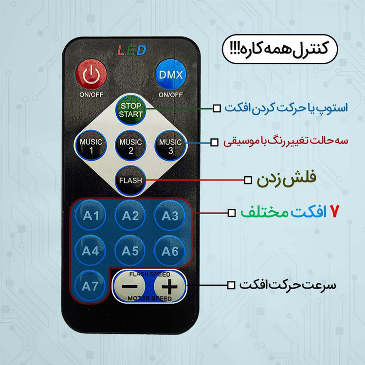 دارای یک کنترل که میتونید به کمک اون رقص نور رو از راه دور کنترل کنید.