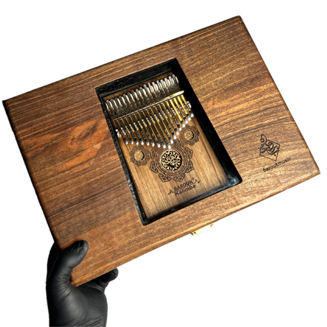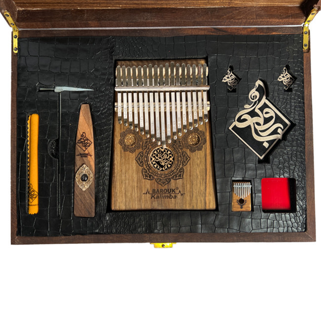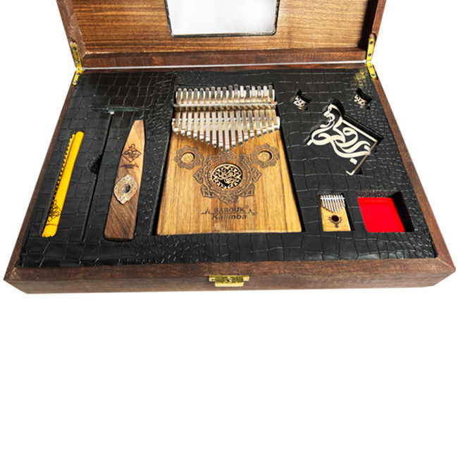 تمامی باکس و ساز کالیمبا و ساز کازو از چوب یک تیکه گردو کهن صد ساله ساخته شده است و اقلام همراه این ست شامل باکس چوبی ، ساز کالیمبا ، ساز کازو ، چکش کوک ، پایه نگهدارنده ی ساز کالیمبا ، برچسب نت ، زنجیر افکت ، جوجه کالیمبا ، دستمال تنظیف و … میباشد