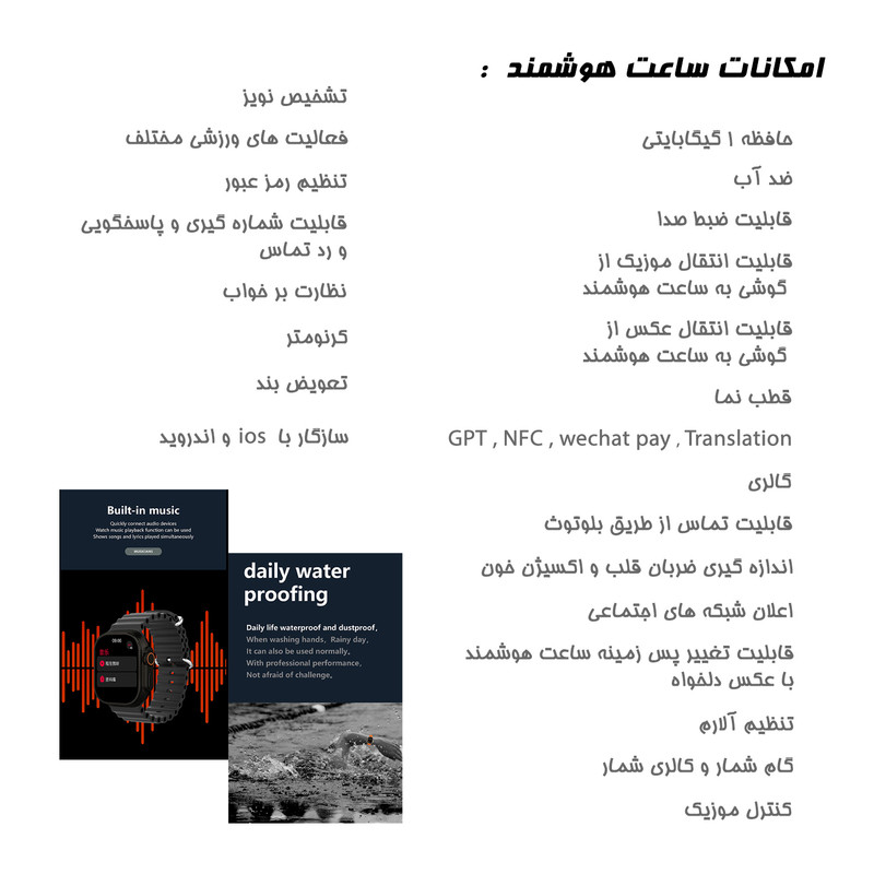 دارای ۱ گیگ حافظه ضد آب ضبط صدا قابلیت انتقال موزیک و عکس از گوشی موبایل به ساعت از طریق اپ مخصوص ساعت تنظیم الارم ماشین حساب