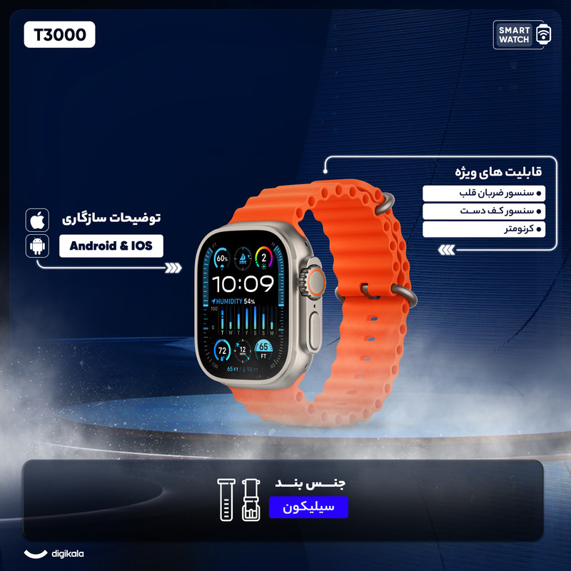 ساعت هوشمند مدل T3000 دارای قابلیت های صفحه نمایش رنگی، صفحه نمایش لمسی بند سیلیکون