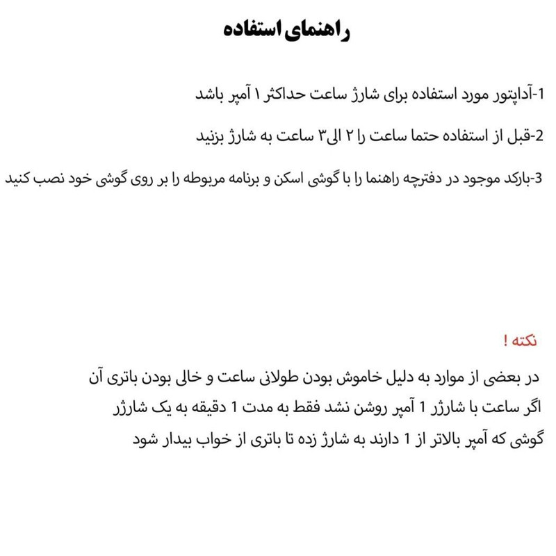 ساعت هوشمند فقط با آداپتور ۱ آمپر شارژ شود و از فستشارژر استفاده نشود چون به باتری آسیب میزند. در اولین استفاده، ساعت نیاز به شارژ اولیه ۲ تا ۳ ساعته دارد. عدم رعایت این موارد باعث کاهش عمر باتری میشود.