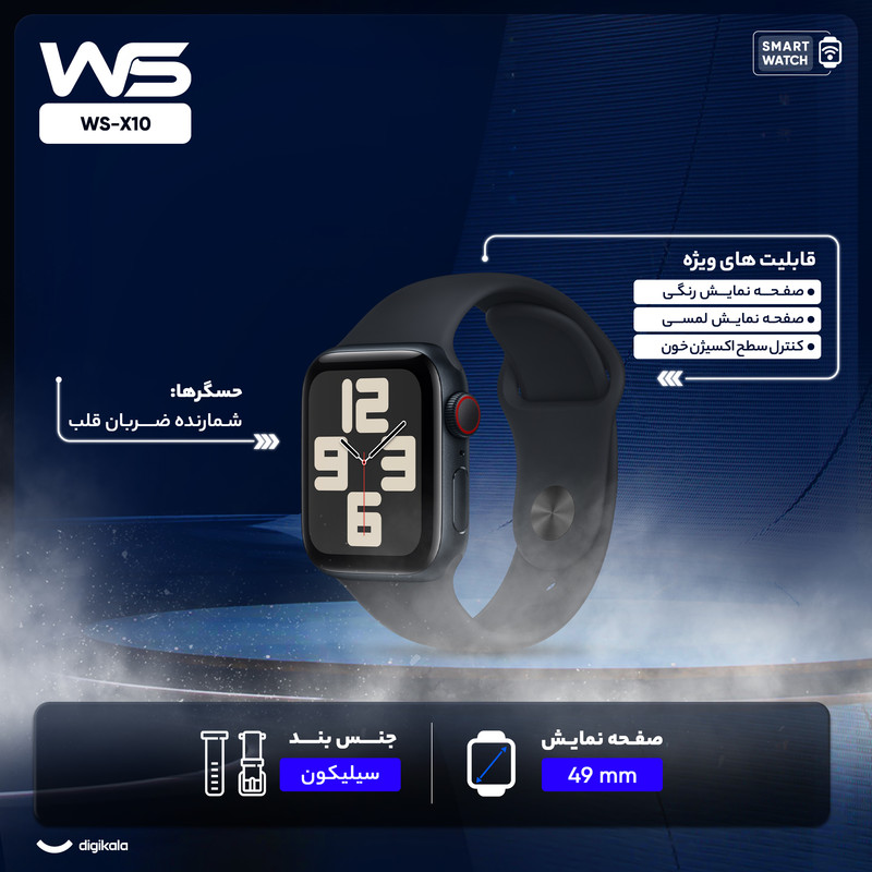 ساعت هوشمند دبلیو اِس مدل WS-X10 دارای قابلیت های صفحه همیشه روشن (Always-on Display)، کنترل موسیقی (Music Player) بند سیلیکون