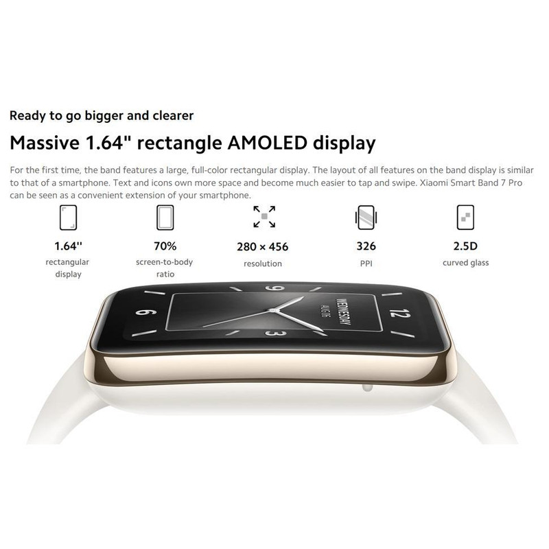 نوع AMOLED سایز 1.64 اینچ (~70% نسبت نمایشگر به بدنه) رزولوشن 280 در 456 پیکسل (~326 پیکسل در اینچ تراکم پیکسلی) نمایشگر با لبههای خمیده (2.5D)