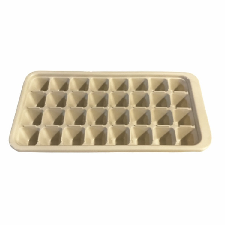 ۳۲ قطعه منظم مربعی قطر هر قطعه یخ ۲/۶ سانت جداره های جدا کننده اطراف هر قطعه قسمت مخصوص در یک طرف قالب جهت راحت تر برداشتن