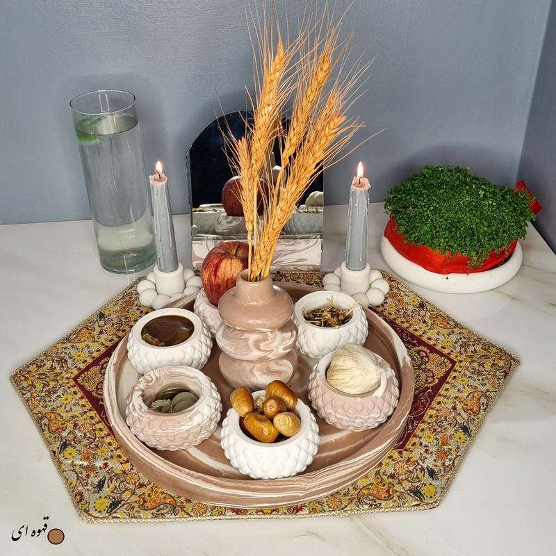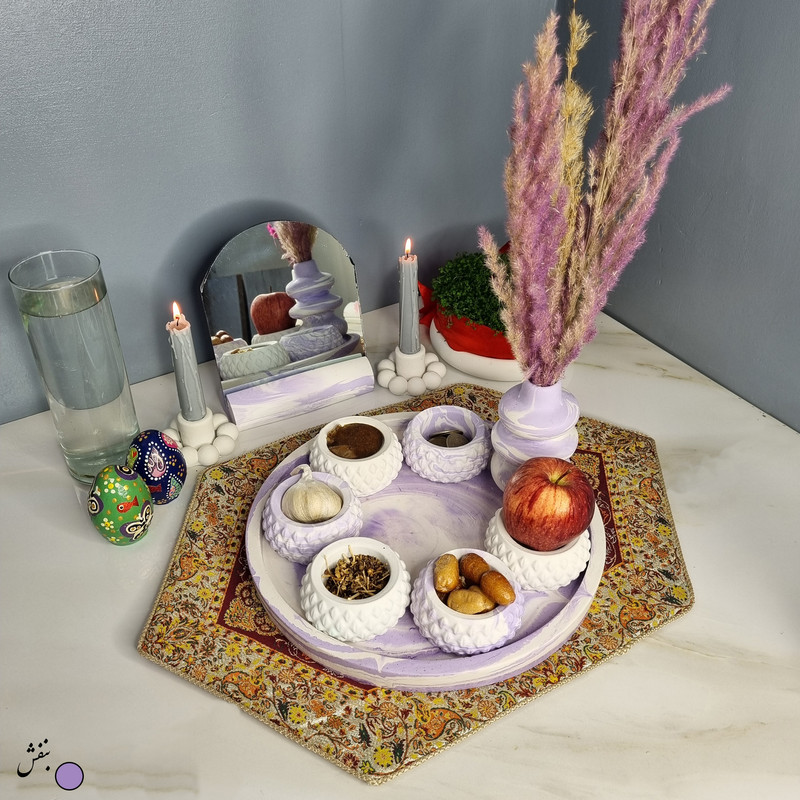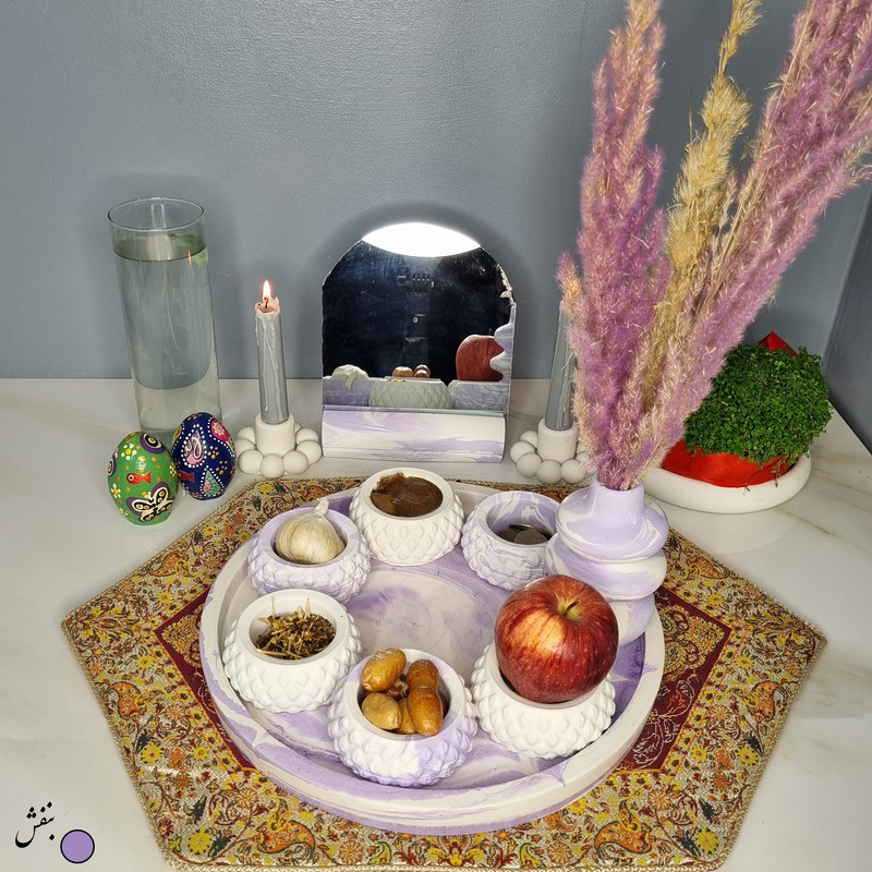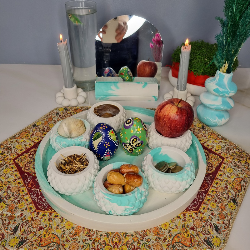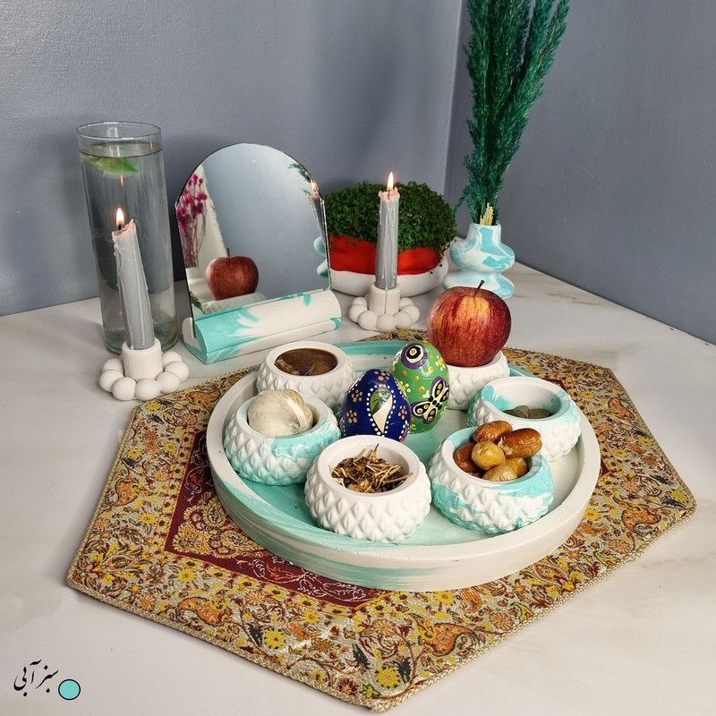 یک هفتسین کوچک و بهصرفه اقتصادی، جوانب زیبایی و معنوی هفتسین را در یک فضای کمحجم به شما معرفی میکند. این محصول، شامل آینه و استند آن، دو شمعدان، شش ظرف هفت سین ، یک گلدان بتنی آبشاری و سینی بتنی است. با این هفتسین جمعوجور، شما میتوانید تمام نمادهای مهم نوروز را در فضای محدود خود گنجانده و لحظاتی شاد و پر از هنر و زیبایی را به اشتراک بگذارید. این هفتسین زیبا ابر و بادی یک گزینه ایدهآل برای کسانی است که به دنبال یک آغاز سال نو معنوی و زیبا هستند و همچنین توجهی به محیط قرارگیری هفتسین و صرفة اقتصاد آن دارند. یک آثار هنری زیبا و منحصربهفرد که به آرامش و زیبایی نوروزی به خانهتان جلوه خواهد داد.