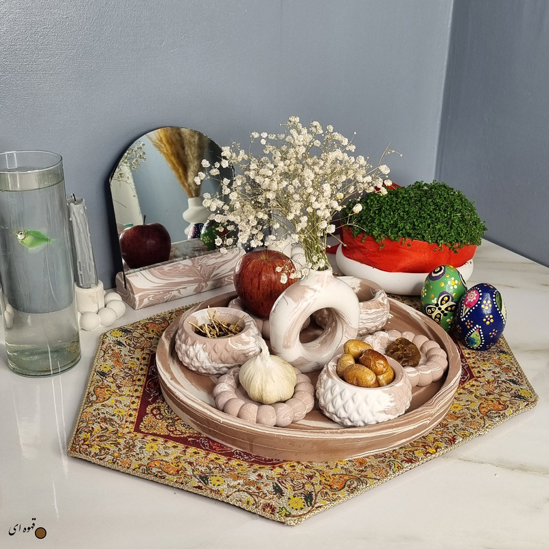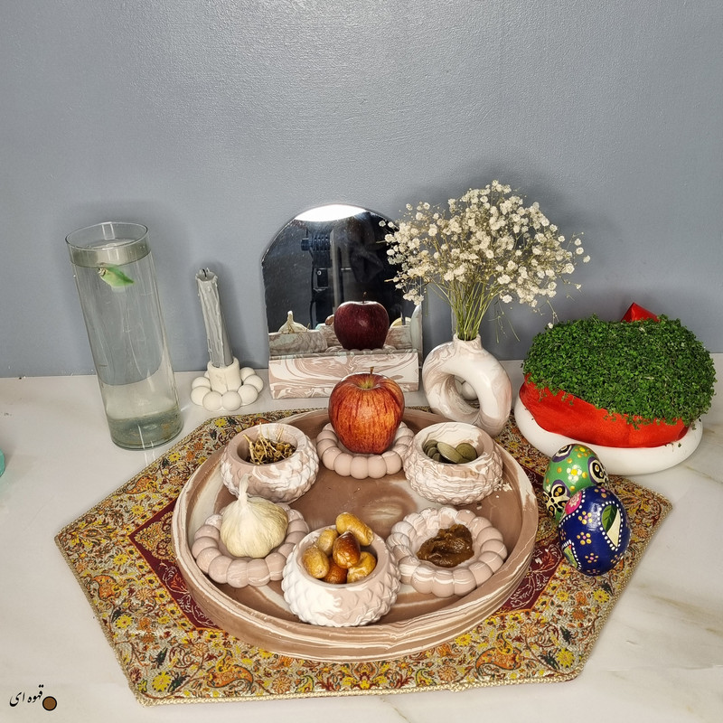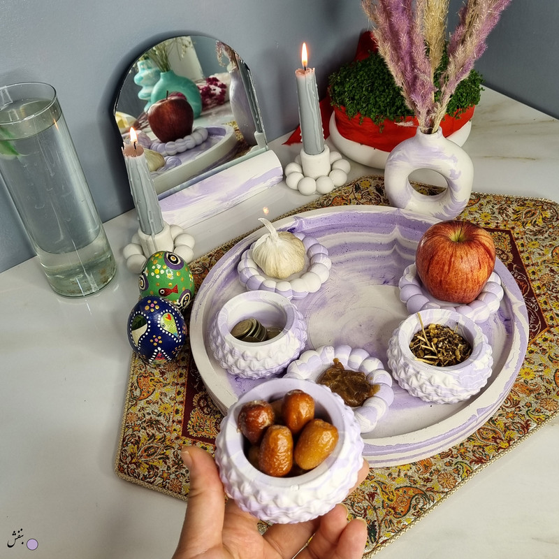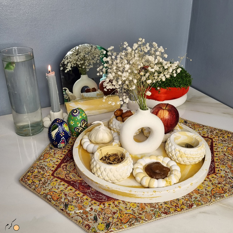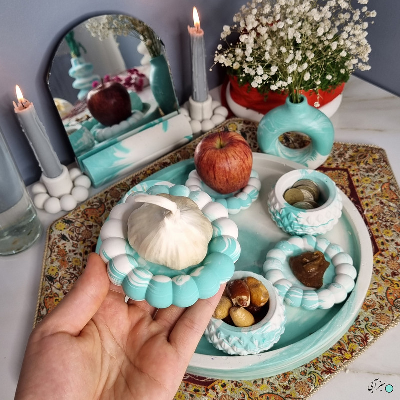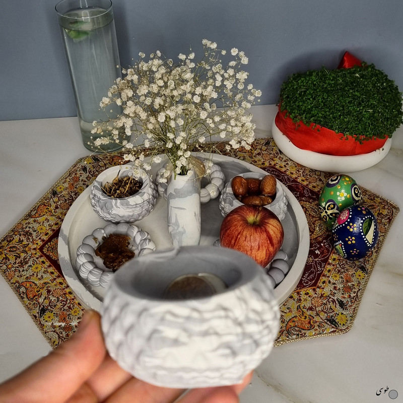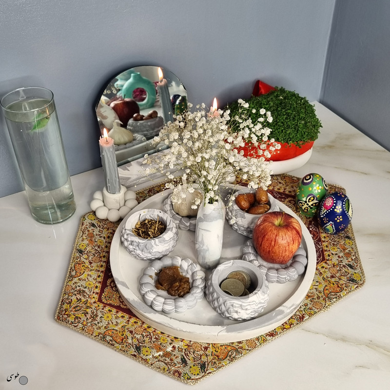 یک هفتسین کوچک و بهصرفه اقتصادی، جوانب زیبایی و معنوی هفتسین را در یک فضای کمحجم به شما معرفی میکند. این محصول، شامل آینه و استند آن، دو شمعدان، شش ظرف هفت سین ، یک گلدان بتنی دونات و سینی بتنی است. با این هفتسین جمعوجور، شما میتوانید تمام نمادهای مهم نوروز را در فضای محدود خود گنجانده و لحظاتی شاد و پر از هنر و زیبایی را به اشتراک بگذارید. این هفتسین زیبا ابر و بادی یک گزینه ایدهآل برای کسانی است که به دنبال یک آغاز سال نو معنوی و زیبا هستند و همچنین توجهی به محیط قرارگیری هفتسین و صرفة اقتصاد آن دارند. یک آثار هنری زیبا و منحصربهفرد که به آرامش و زیبایی نوروزی به خانهتان جلوه خواهد داد.