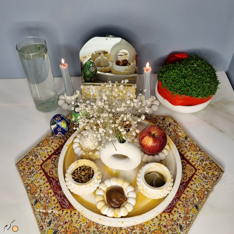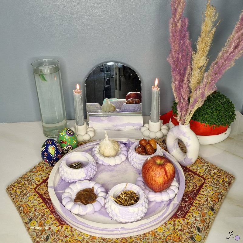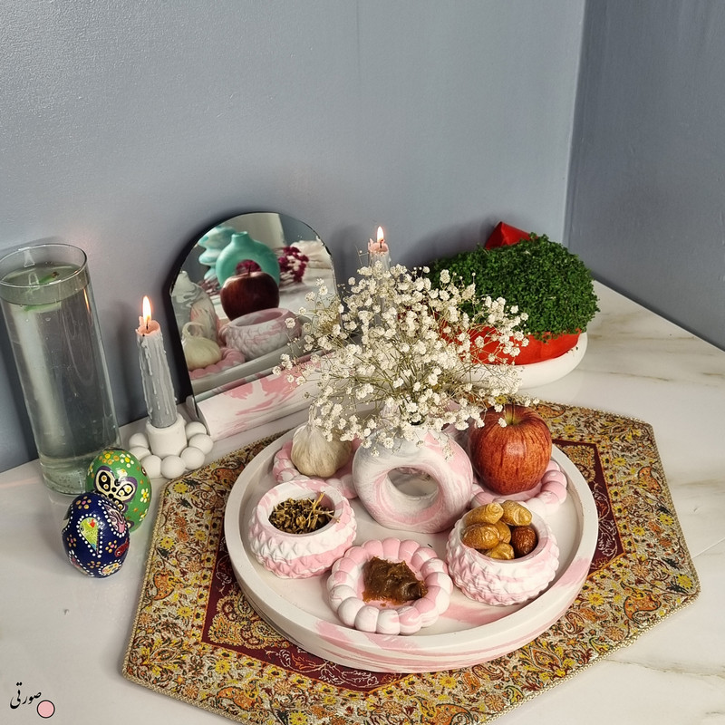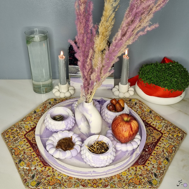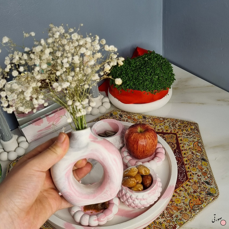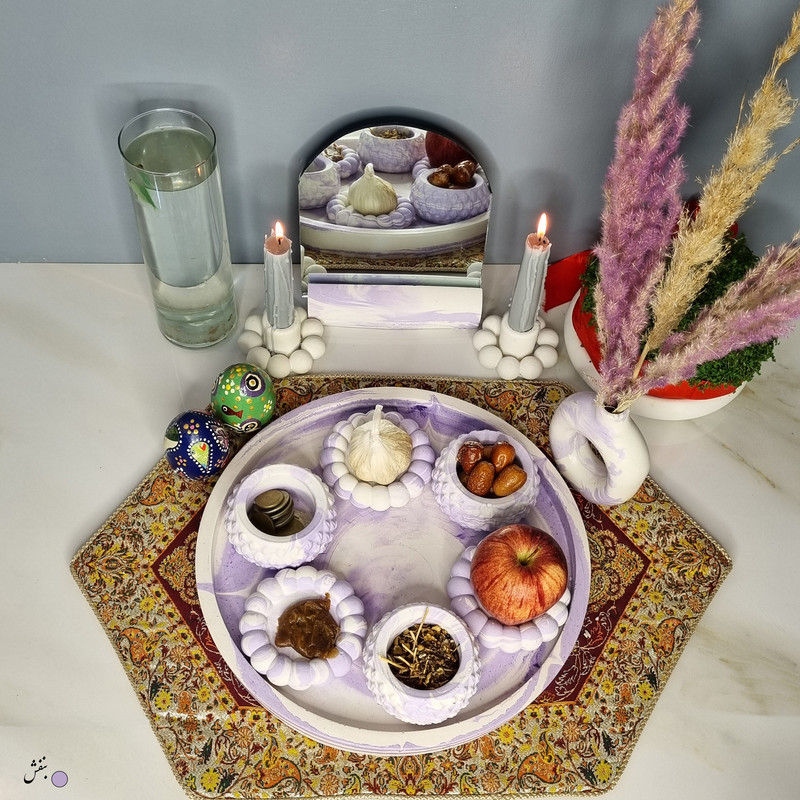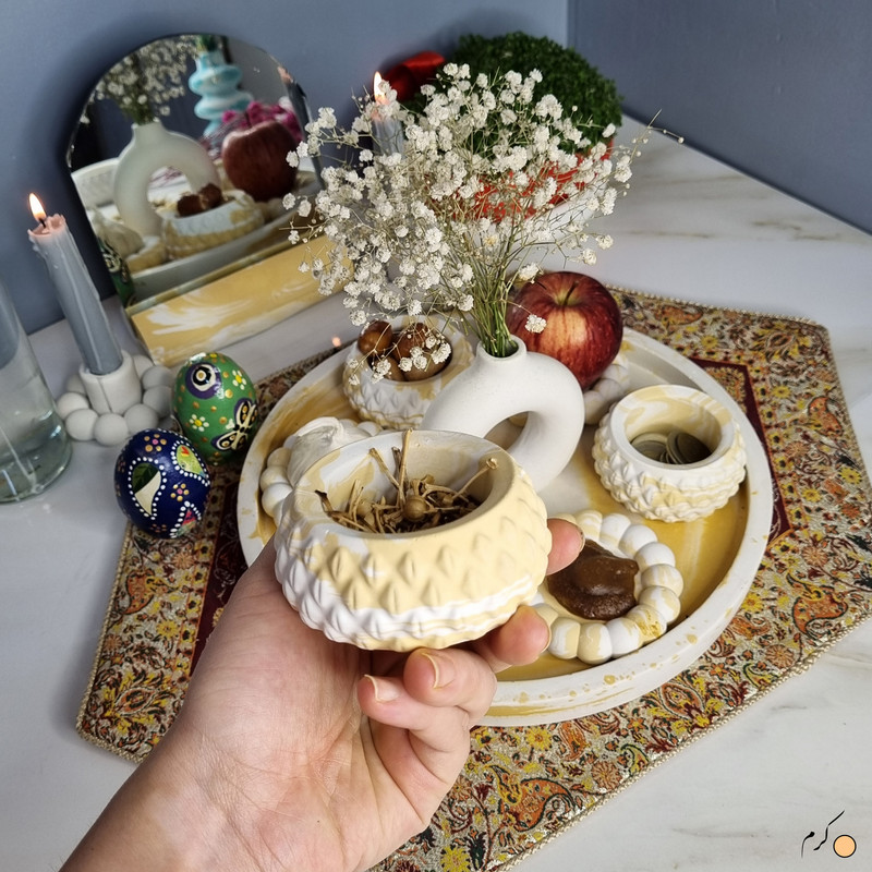 یک هفتسین کوچک و بهصرفه اقتصادی، جوانب زیبایی و معنوی هفتسین را در یک فضای کمحجم به شما معرفی میکند. این محصول، شامل آینه و استند آن، دو شمعدان، شش ظرف هفت سین ، یک گلدان بتنی دونات و سینی بتنی است. با این هفتسین جمعوجور، شما میتوانید تمام نمادهای مهم نوروز را در فضای محدود خود گنجانده و لحظاتی شاد و پر از هنر و زیبایی را به اشتراک بگذارید. این هفتسین زیبا ابر و بادی یک گزینه ایدهآل برای کسانی است که به دنبال یک آغاز سال نو معنوی و زیبا هستند و همچنین توجهی به محیط قرارگیری هفتسین و صرفة اقتصاد آن دارند. یک آثار هنری زیبا و منحصربهفرد که به آرامش و زیبایی نوروزی به خانهتان جلوه خواهد داد.