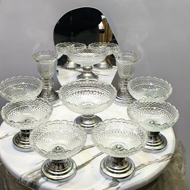 قطر حدودی کاسه های کوچک 12 سانتی متر ارتفاع حدودی 9 سانتی متر قطر کاسه بزرگ حدود 18 سانتی متر ارتفاع 9 سانتی متر دو عدد شمعدان به ارتفاع حدودی 14 سانتی متر آینه با ارتفاع حدودی 20-25 سانتی متر با پایه چوبی