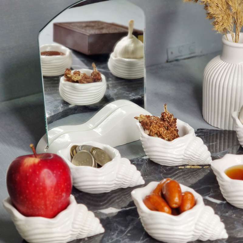 مجموعه هفت سین صدف گوش ماهی تولید شده مجموعه با مقاومت و طول عمر بالا در برابر سرما و گرما ، دارای براقیت منحصربفرد ، استحکام زیاد و با قابلیت شستشو کامل حتی در ماشین ظرفشویی می باشد . قطر هر ظرف : 7 سانتیمتر