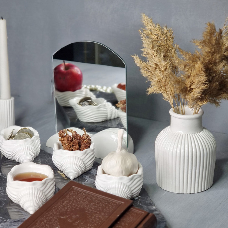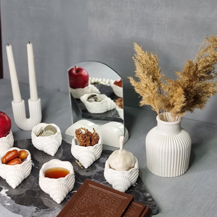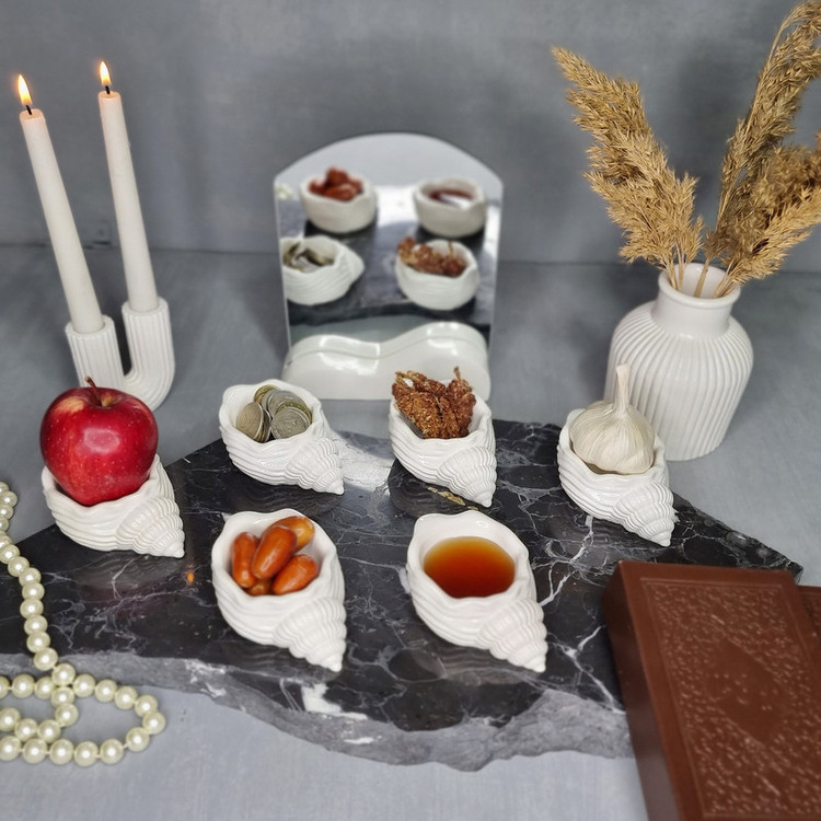 مجموعه هفت سین صدف گوش ماهی تولید شده مجموعه با مقاومت و طول عمر بالا در برابر سرما و گرما ، دارای براقیت منحصربفرد ، استحکام زیاد و با قابلیت شستشو کامل حتی در ماشین ظرفشویی می باشد . قطر هر ظرف : 7 سانتیمتر