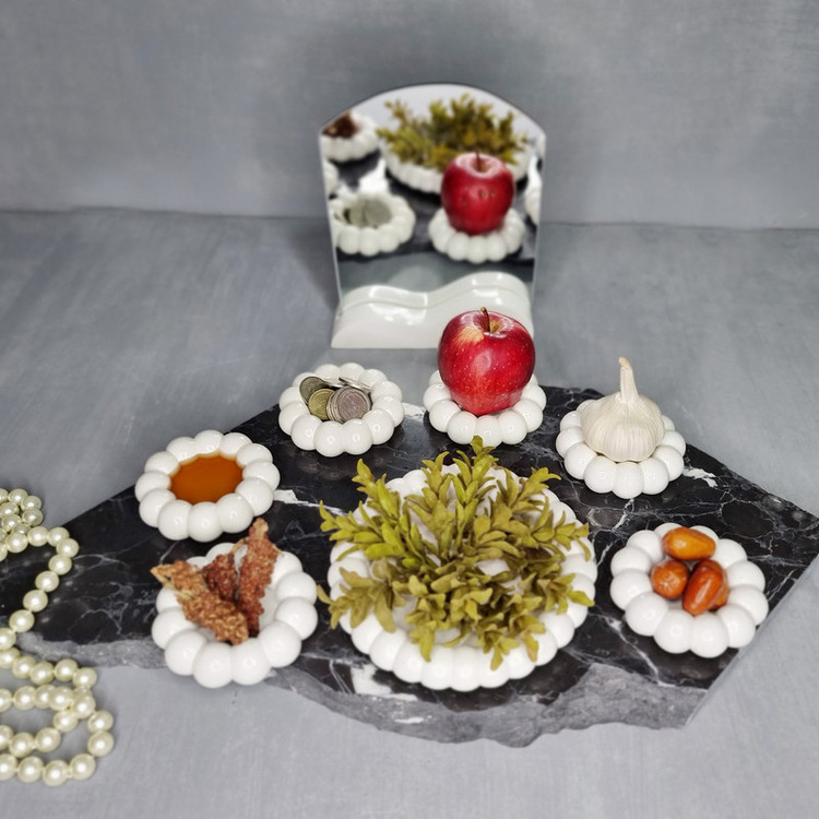 مجموعه هفت سین مرواریدی کوچک تولید شده مجموعه با مقاومت و طول عمر بالا در برابر سرما و گرما ، دارای براقیت منحصربفرد ، استحکام زیاد و با قابلیت شستشو کامل حتی در ماشین ظرفشویی می باشد . قطر هر ظرف : ۸.۵ سانتیمتر – قطر ظرف سبزه ۱۶ سانتیمتر