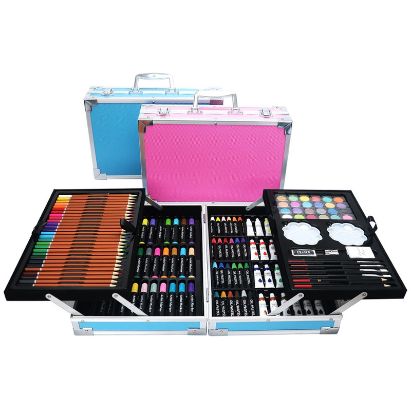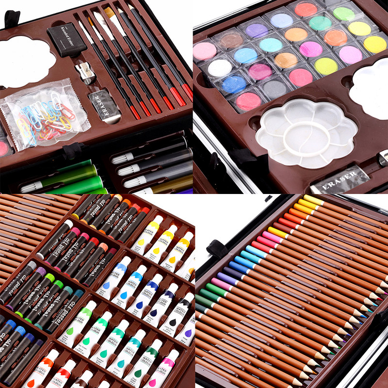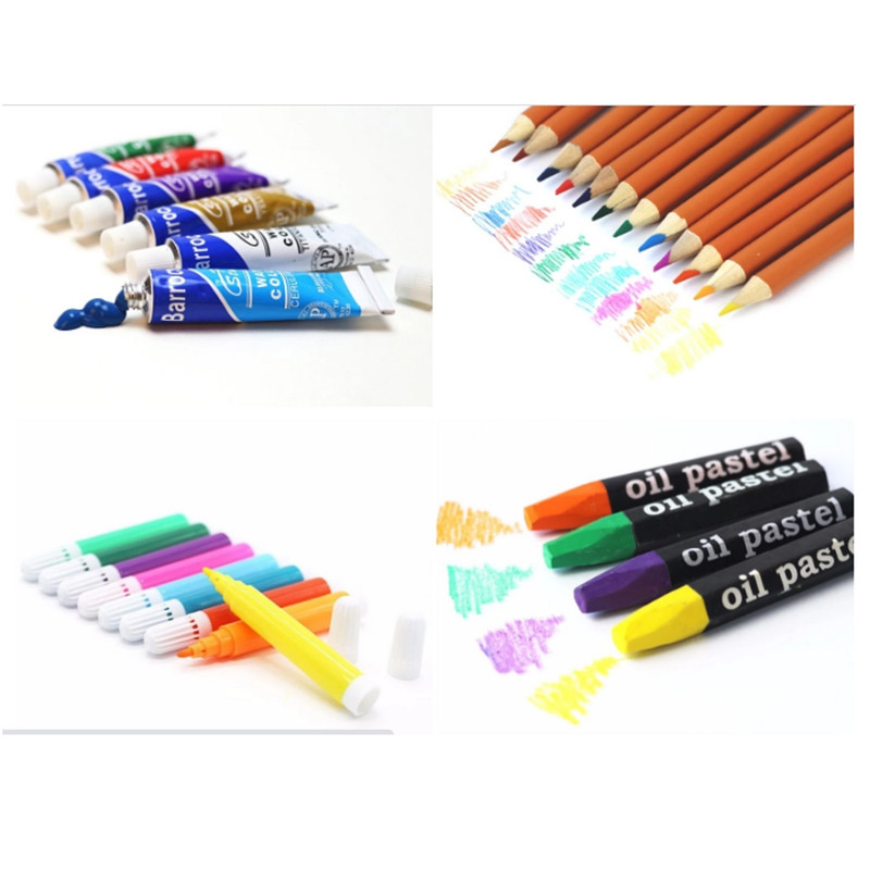 اقلام همراه: این محصول دارای 28 مداد رنگی، 24عدد پاستل، 24عدد آبرنگ، 33عدد ماژیک، 24 عدد رنگ روغن یک عدد مداد مشکی و قرمز، یک عدد تراش، دو عدد پاکن، چهار عددعدد قلم مو گواش