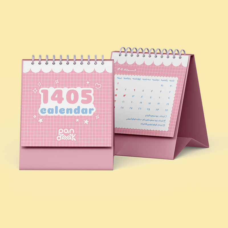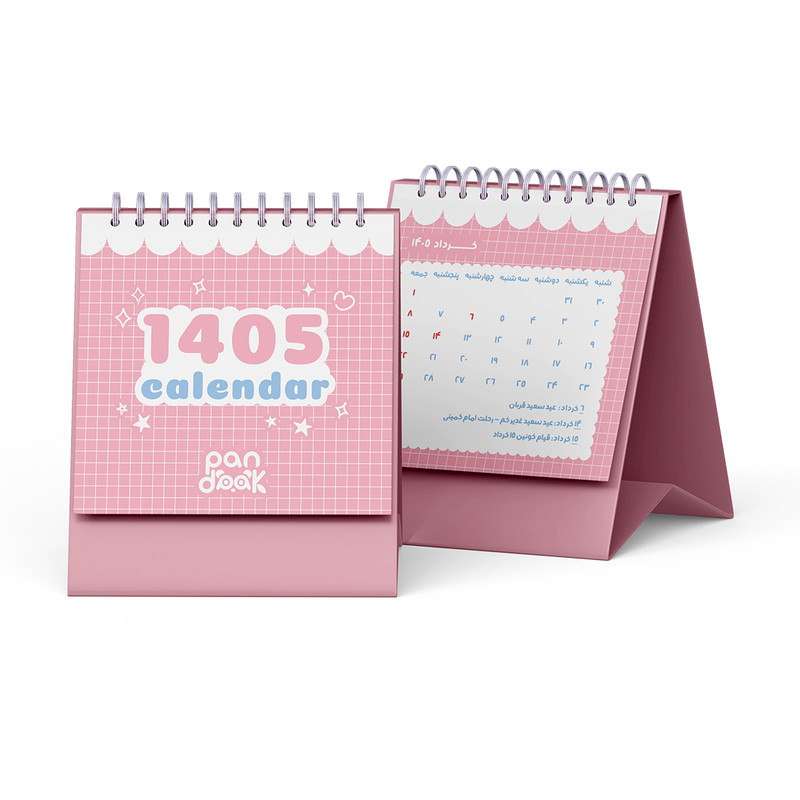 نوع صحافیفنر دوبل فانتزینوع سالنامهتقویم رومیزیسال1405نوع کاغذگلاسهنواخت روزهاماه شمارجنس جلدمقواییفرم صحافیعمودیرنگصورتی
