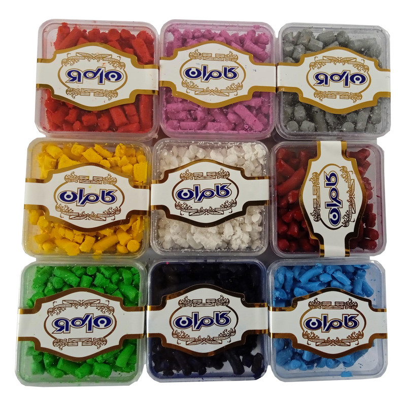 رنگ كامران اقتصادي است و هرچه از رنگ استفاده كنيد از خود رنگ شمع پررنگ تر نمي شود. اين مجموعه شامل رنگهاي قرمر و بنفش و خاكستري و قرمز شرابي و سفيد و زرد و آبي و سياه و سبز مي باشد.