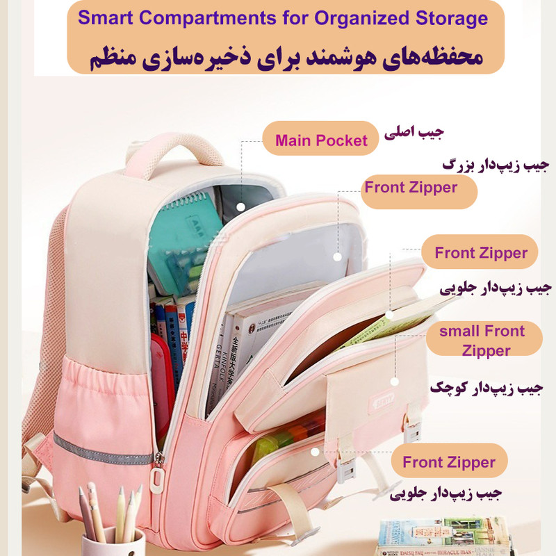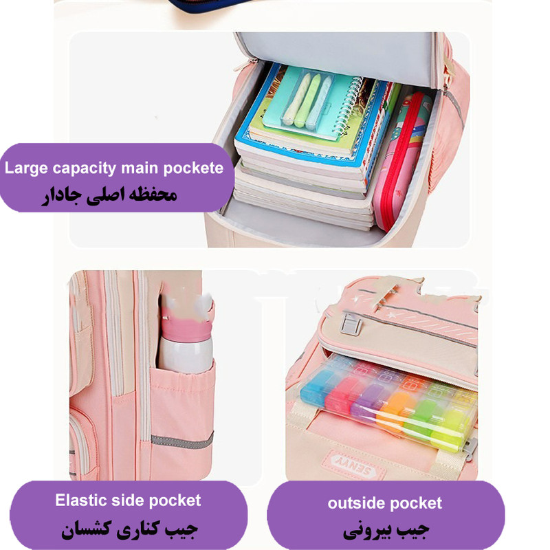 کولهپشتی با کیفیت با طراحی جذاب به ارتفاع 42 سانتیمتر، کوله پشتی مناسب برای دختر ها و پسرهای دبستانی و دانش آموزان راهنمایی می باشد.این کوله پشتی از جنس پلیاستر مقاوم در برابر آب و بسیار سبک است که به راحتی قابل تمیز کردن است، تغییر رنگ نمیدهد، بوی نامطبوع را دفع میکند و دوستدار محیطزیست و سالم است. این کولهپشتی با موفقیت، تست های مربوط به مواد شیمیایی و تست های فیزیکی را پشت سر گذاشته و ایمنی فرزند عزیز شما را تضمین میکند. شانهبندهای بازویی بهبود یافته و علاوه بر قابلیت هدایت هوا برای جلوگیری از عرق سوز شدن. قابلیت تنظیم اندازه نیز دارد. این کوله پشتی با اصول ارگونومیک کودک تطابق دارند تا کودکان احساس راحتی کنند. شانهبندهای قابل تنظیم شامل بندهای بازتابی (شب رنگ) برای افزایش ایمنی کودکان هستند. ظرفیت بزرگ: این کولهپشتی دارای یک محفظه بزرگ است که میتواند اقلام ضروری برای کودکان را نگه دارد، مانند لباس، جعبهی نهار، اسباببازی، خوراکیها، کیف مداد و غیره. این کوله مناسب برای پوشههای A4 و دفترهای تمرین است. مناسب برای مواقع مختلف، از جمله مدرسه، سفر، خرید و یک گزینه عالی برای هدیه به کودکان است. این یک هدیه عالی برای تولد و سال نو است و جشن روز اول مدرسه است. این کوله پشتی به عنوان کولهپشتی و کولهپشتی سفری کودکان استفاده میشود