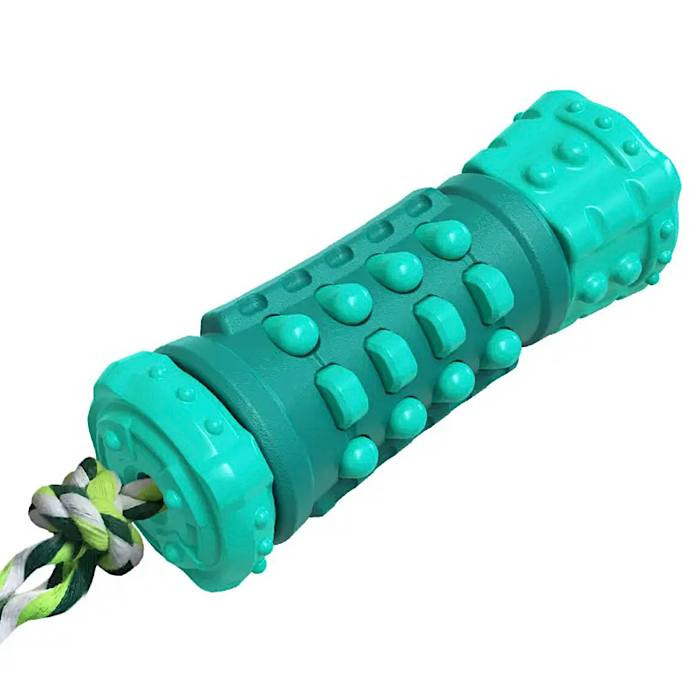 این محصول از جنس لاستیک بسیار مقاوم در برابر جویدن پت ساخته شده است. به دلیل جنس مقاوم، بسیار مناسب استفاده ی سگ حتی برای ساعات طولانی می باشد. قسمت بالایی اسباب بازی به دلیل شیار و برامدگی های زیاد، به تمیز شدن دندان ها کمک میکند و از پوسیدگی آنها جلوگیری خواهد کرد. این محصول به دلیل شباهت به استخوان و همچنین صدادار بودن آن باعث جلب توجه پت و هیجان او می شود، بنابراین در حرف شنوی و تربیت پت بسیار کاربردی خواهد بود.