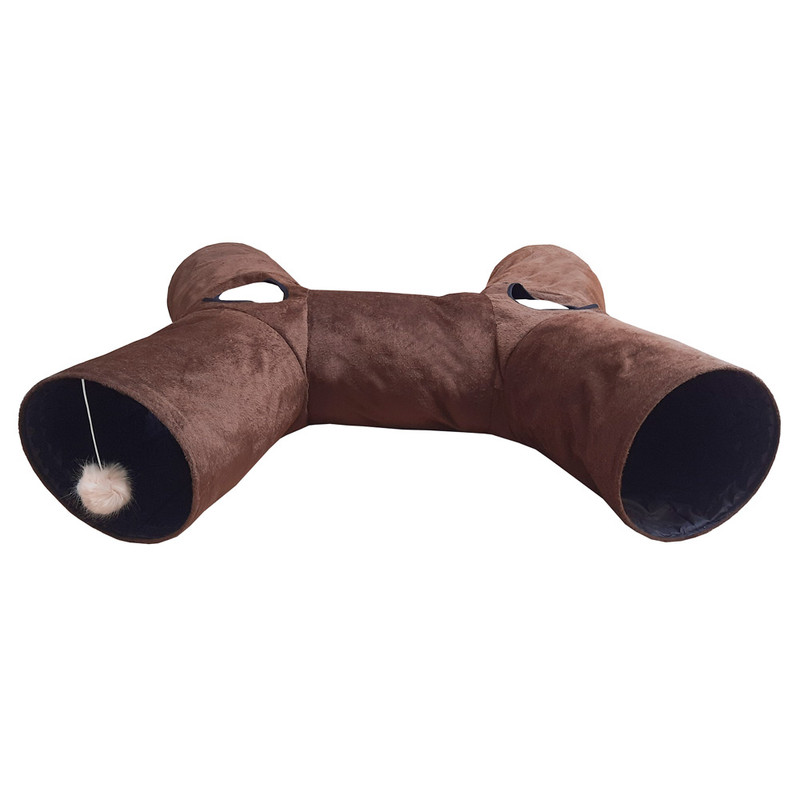 یکی دیگر از اسباب بازی های گربه که هیواپت در اختیار مشتریان قرار داده مدل تونل چهارشاخه می باشد. این محصول در ابعاد 90x90 با ارتفاع 30 سانتی متر و وزن 650 گرم است. قطر دهانه تونل 25سانتی متر می باشد. جنس پارچه آن از پولیش نرم است تا گربه ها به راحتی درون ان بازی کنند. تونل های متنوع آن باعث می شود تا گربه ها بیشتر سرگرم شوند ونیاز خود را از این طریق برطرف کنند. همچنین دوعدد ورودی در بالای محصول وجود دارد. دارای دوعدد پوم پوم می باشد تا نشاط گربه ها را فراهم کند. به راحتی قابل حمل و جابه جایی می باشد. قابلیت شستشو نیز دارد و برای کسانی که یک یا چند گربه دارند بسیار وسیله مناسبی می باشد. این تونل برای بچه گربه ها و گربه های بالغ نیز قابل استفاده می باشد.