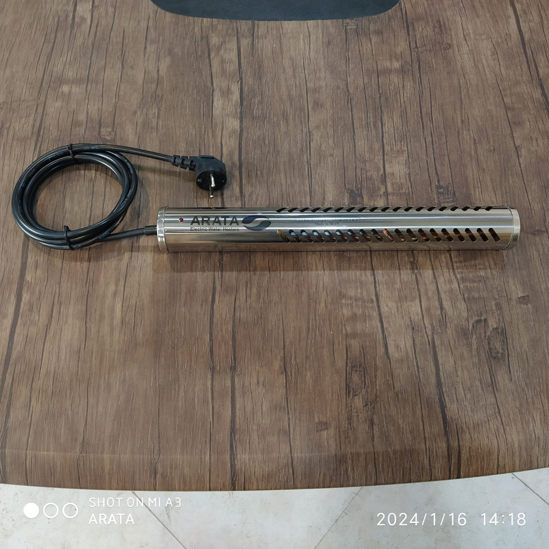 آبگرمکن برقی غرقابی آراتا مدل 3020S محصولی نوین با قدرت 3000 وات است که می تواند در داخل انواع مخازن آب مانند بشکه، تانکر، منبع پلاستیکی، بیست لیتری، دبه و امثالهم و یا در جکوزی و استخرهای کوچک خانگی بصورت شناور (در داخل آب) قرار گیرد تا باعث گرم شدن آنها گردد. المنت مربوطه دارای استاندارد بوده و کابل ورودی برق نیز کاملا آب بند گردیده است (دارای گواهینامه استاندارد IPX8-Waterproof). در این محصول از کابل برق سه رشته (با سیم ارت) و دوشاخه استاندارد استفاده شده است. این آبگرمکن قادر است 50 لیتر آب را در هر دقیقه به میزان یک درجه سانتی گراد گرمتر نماید. همچنین امکان استفاده برای گرم کردن مخازن سوخت گازوئیل یا روغن هیدرولیک دستگاه های صنعتی بویژه در زمستان (با رعایت کامل موازین ایمنی) مقدور است. آبگرمکن غرقابی آراتا در سفر و کمپینگ و نیز در مواقع حوادث غیر مترقبه مانند سیل و زلزله بعنوان ابزار مناسبی جهت تأمین آب گرم فوری و ضروری می تواند بخوبی مورد استفاده قرار گیرد. هر کیلو وات 4.5 آمپر جریان لازم دارد و لذا این محصول نیاز به 13.5 آمپر جریان دارد. هزینه مصرف برق بستگی به مقدار مصرف آب گرم و نوع تعرفه برق شما دارد. بطور میانگین به ازای هر ساعت کارکرد مداوم 3 کیلو وات ساعت مصرف برق دارد که حدود 1000 تومان خواهد شد. در استفاده از این دستگاه باید حتماً دقت لازم بعمل آید تا خارج از آب به برق متصل نگردد زیرا انباشت حرارتی روی داده و باعث سوختن المنت خواهد شد.