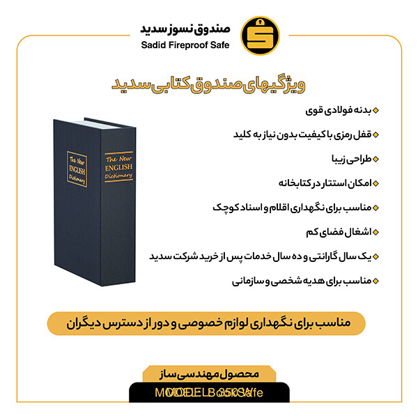 صندوق کتابی مخفی سدید دقیقا همین نیاز را پاسخ میدهد. این صندوق با برند معتبر سدید، هم سبک است و هم محکم، بهراحتی در کتابخانه شخصی شما قرار میگیرد و با ظاهر کتابی که در کنار سایر کتابها پنهان میشود، جلب توجه نمیکند. بدنه فولادی آن از ورقه ST37 ساخته شده تا اشیای گرانبها مثل طلا، جواهر و ساعتها در مکانی مخفی نگهداری شود. قفل رمزدار مرغوب این صندوق، خطر گم شدن یا خرابی کلیدها را نخواهد داشت و دسترسی به اشیای ارزشمند را تنها با دانستن رمز ممکن میکند.