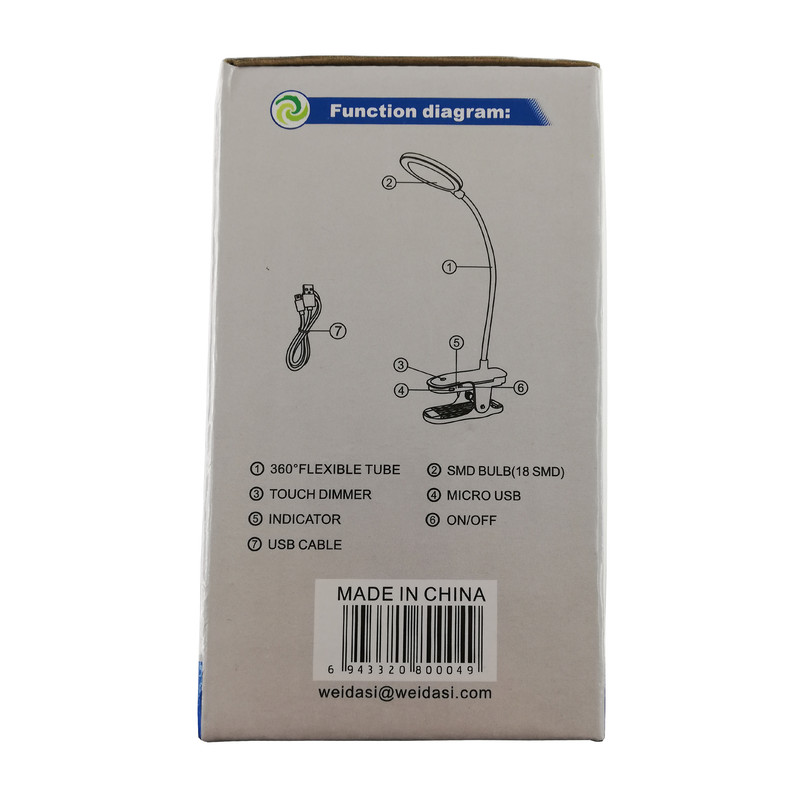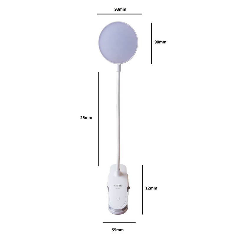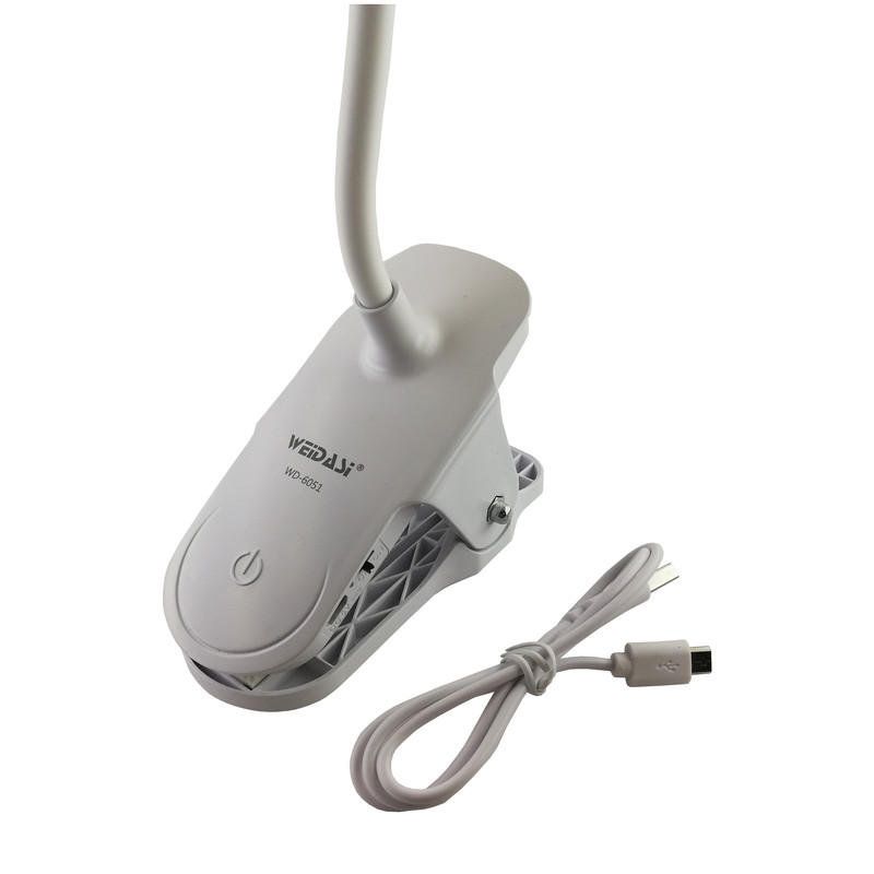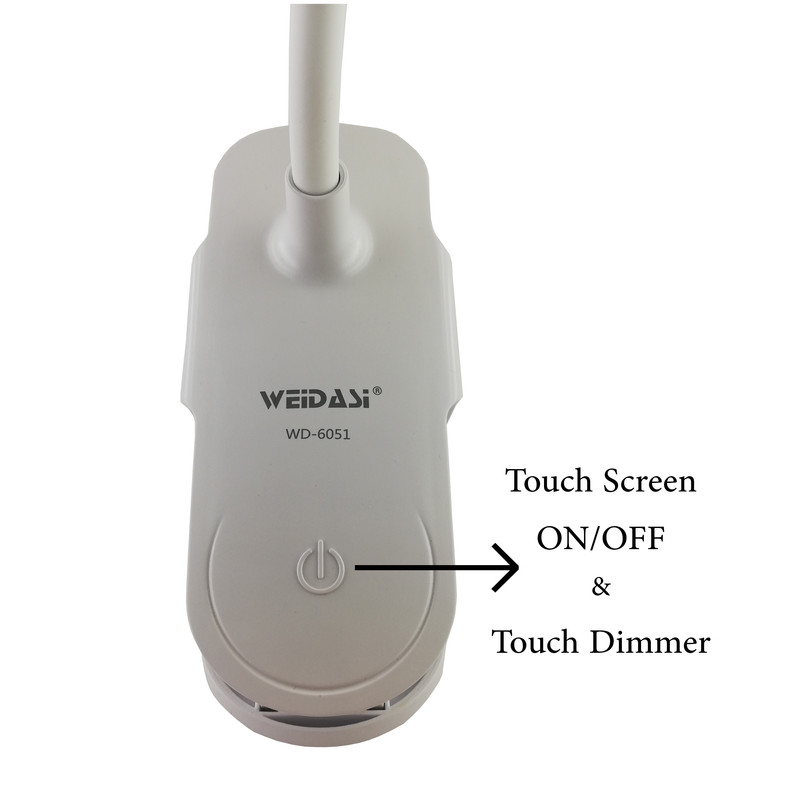 این محصول یکی از جدیدترین تولیدات کمپانی ویداسی (WEDASI) است. این چراغ مطالعه گیره دار بوده که می توان به هر جای ممکن مانند میز کار متصل کرد. بدنه ی آن قابل انعطاف بوده و می توان به راحتی آن را خم کرد و در مکان مورد نظر قرار داد. لامپ آن از نوع SMD می باشد (18 عدد SMD) و دارای نوردهی مطلوب، مصرف پایین و عمر بالا می باشد. یک باطری قابل شاژ در داخل پایه چراغ قرار دارد که شما را از برق مستقیم شهر بی نیاز می کند. و در مواقعی که برق قطع است شما می توانید به راحتی به مطالعه و انجام کارهای خود ادامه دهید. این چراغ مطالعه دارای یک دکمه لمسی می باشد که توسط آن می توان نور لامپ را به میزان دلخواه تنظیم کرد به این صورت که با لمس این دکمه و نگه داشتن انگشت روی آن نور لامپ کاهش یافته و با لمس مجدد آن نور لامپ افزایش می یابد (دیمر لمسی). از مزیت این چراغ مطالعه علاوه بر کم مصرف بودن آن، طراحی زیبا و وزن کم آن می باشد. که به راحتی می توان آن را با خود حمل کرد.