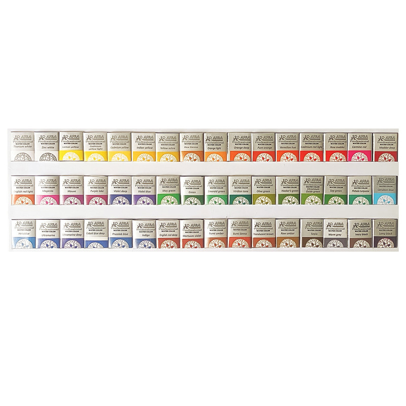 آبرنگ افرا توانسته در تعداد قرص های 12، 18، 24، 36، 48 و .. محصولات خود را برای هنرمندان تولید و به بازار عرضه کند. آبرنگ افرا همچنین با تولید قرص های تکی دایره ی تولید رنگ های خاص را نیز ایجاد کند و باعث راحتی این کار برای هنرمندان نقاش خود باشد..