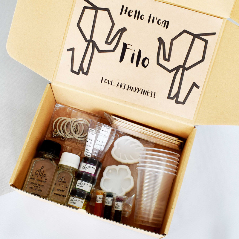 این بسته کار با رزین فیلو باکس یک مجموعه کامل برای افرادی است که تا به حال تجربه کار با رزین اپوکسی را نداشته اند. شما با خرید این بسته اقتصادی بدون نیاز به هیچ ابزار اضافه و آموزش اولیه ای می توانید کار جذاب با رزین اپوکسی را تجربه کنید. این مجموع شامل یک بروشور آموزشی برای یادگیری اصول اولیه کار با رزین اپوکسی برای کسانی است که تا به حال از رزین اپوکسی نکرده اند. همچنین شما می توانید با اسکن QR کد موجود در بسته بندی محصول توسط موبایل خود به ویدیو آموزشی این بسته کار با رزین دسترسی پیدا کنید. رزین و هاردنر 90 گرمی موجود در این بسته از نوع غلیظ، کاملا شفاف بوده و از کیفیت بسیار زیادی برخوردار است. محتویات داخل بسته بندی برای ساخت حداقل 6 جا کلیدی زیبا و جذاب رزینی کافی است. این بسته شامل دو قالب سیلیکونی با کیفیت در دو طرح برگ انجیر و گل پنج پر است که پس از پایان یافتن رزین داخل بسته با خرید جداگانه رزین همچنان قابل استفاده خواهند بود. سه رنگ جوهری (شفاف) بسیار با کیفیت و همچنین 3 رنگ اکلیل درشت از دیگر محتویات این بسته است. پیمانه های مدرج شده مخصوص کار با رزین اپوکسی، چوب بستنی برای مخلوط کردن، خلال چوبی برای استفاده از رنگها، لیوان یک بار مصرف، حلقه کلید و اتصال موجود در این بسته شما را از تهیه هر گونه وسیله اضافه برای کار با این بسته کاملا بی نیاز خواهد کرد.
