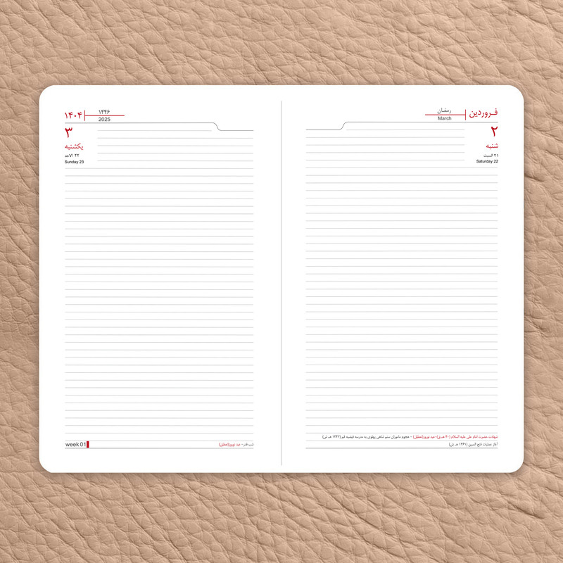 ویژگیهای سررسید روزشمار مداد رنگی جلد این سررسید از نوع چرم میباشد. کیفیت این چرم نسبت به مدل های دیگر بهتر میباشد. هنگام صحافی آن روی مقوای جلد هیچگونه ناهمواری و چروک ایجاد نمیگردد. یکی دیگر از مزایای مثبت این سالنامه داشتن خودکار همراه خود می باشد. در نتیجه تمام وسایل مورد نیاز نوشتن را همواره همراه خود خواهید داشت. تلفیق سه آیتم کش، روبان و دور رنگ سبب گردیده تا این محصول در عین سادگی دارای جذابیت به خصوصی باشد. همچنین استفاده از خودکار با بدنه مشکی جلد، هارمونی منحصر به فردی در این محصول ایجاد کرده است. “خودکار این سالنامه امکان درج آرم و یا چاپ به صورت اختصاصی را در تیراژهای بالا نیز دارد”. فرمت روز شمار صفحات داخلی سررسید روزشمار کبریتی به صورت روزشمار می باشد و تنها روزهای پنجشنبه و جمعه در یک روز قرار دارند. در تمام روزها مناسبت های همان روز درج گردیده و تعطیلات نیز با رنگ قرمز مشخص شده اند . در ابتدای این سررسید سال در یک نگاه 1404و 1405مشاهده خواهید کرد همچنین ضمیمه های سال 1404و تعطیلات رسمی نیز در ابتدای سررسید درج گردیده است . در انتهای این سررسید اطلاعات مربوط به متروی تهران، اتوبوسرانی، اختلاف ساعت کشورها و برگه یادداشت تلفن های تماس و خط کش را مشاهده خواهید کرد که برای مخاطبان بسیار کاربردی می باشد . تکنیک صحافی سررسید اروپایی چرمی مدل مداد رنگی همراه با خودکار، از تکنیک صحافی دوخت و چسب گرم بهره میبرد. آستر بدرقه ابتدایی این سررسید به شکل آستر سرخورد می باشد. یکی از مزیت های استفاده از آستر سرخورد در کتابها و دفترها در این است که صفحات ابتدایی آستر سررسید به صفحات داخلی دوخت میشود. این امر سبب شده سررسید با این تکنیک آستر عمر بیشتری نسبت به آستر چسبونی داشته باشد.