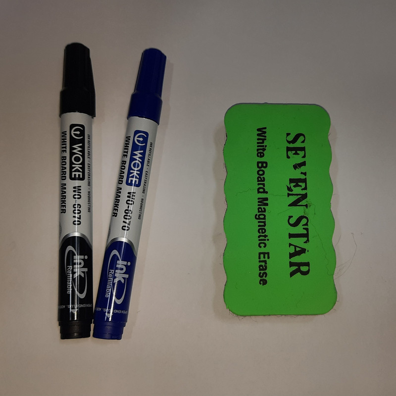 به همراه 2 عدد ماژیک وایت برد ( آبی و مشکی ) و یک عدد تخته پاکن است.