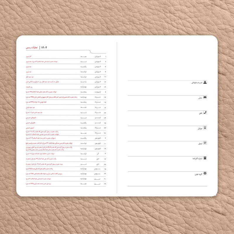 ویژگیهای سررسید روزشمار مداد رنگی همراه با خودکار جلد این سررسید از نوع چرم میباشد. کیفیت این چرم نسبت به مدل های دیگر بهتر میباشد. هنگام صحافی آن روی مقوای جلد هیچگونه ناهمواری و چروک ایجاد نمیگردد. یکی دیگر از مزایای مثبت این سالنامه داشتن خودکار همراه خود می باشد. در نتیجه تمام وسایل مورد نیاز نوشتن را همواره همراه خود خواهید داشت. تلفیق سه آیتم کش، روبان و دور رنگ سبب گردیده تا این محصول در عین سادگی دارای جذابیت به خصوصی باشد. همچنین استفاده از خودکار با بدنه مشکی جلد، هارمونی منحصر به فردی در این محصول ایجاد کرده است. “خودکار این سالنامه امکان درج آرم و یا چاپ به صورت اختصاصی را در تیراژهای بالا نیز دارد”. فرمت روز شمار صفحات داخلی سررسید روزشمار کبریتی به صورت روزشمار می باشد و تنها روزهای پنجشنبه و جمعه در یک روز قرار دارند. در تمام روزها مناسبت های همان روز درج گردیده و تعطیلات نیز با رنگ قرمز مشخص شده اند . در ابتدای این سررسید سال در یک نگاه 1404و 1405مشاهده خواهید کرد همچنین ضمیمه های سال 1404و تعطیلات رسمی نیز در ابتدای سررسید درج گردیده است . در انتهای این سررسید اطلاعات مربوط به متروی تهران، اتوبوسرانی، اختلاف ساعت کشورها و برگه یادداشت تلفن های تماس و خط کش را مشاهده خواهید کرد که برای مخاطبان بسیار کاربردی می باشد . تکنیک صحافی سررسید اروپایی چرمی مدل مداد رنگی همراه با خودکار، از تکنیک صحافی دوخت و چسب گرم بهره میبرد. آستر بدرقه ابتدایی این سررسید به شکل آستر سرخورد می باشد. یکی از مزیت های استفاده از آستر سرخورد در کتابها و دفترها در این است که صفحات ابتدایی آستر سررسید به صفحات داخلی دوخت میشود. این امر سبب شده سررسید با این تکنیک آستر عمر بیشتری نسبت به آستر چسبونی داشته باشد.