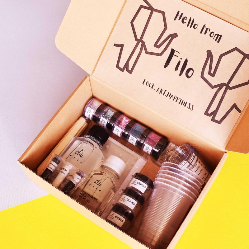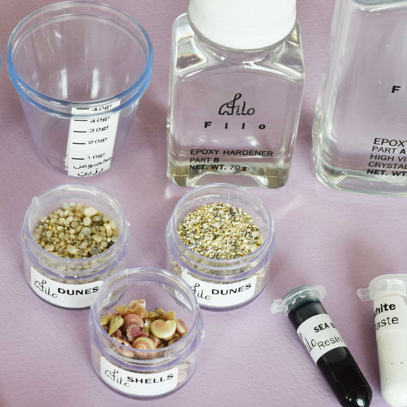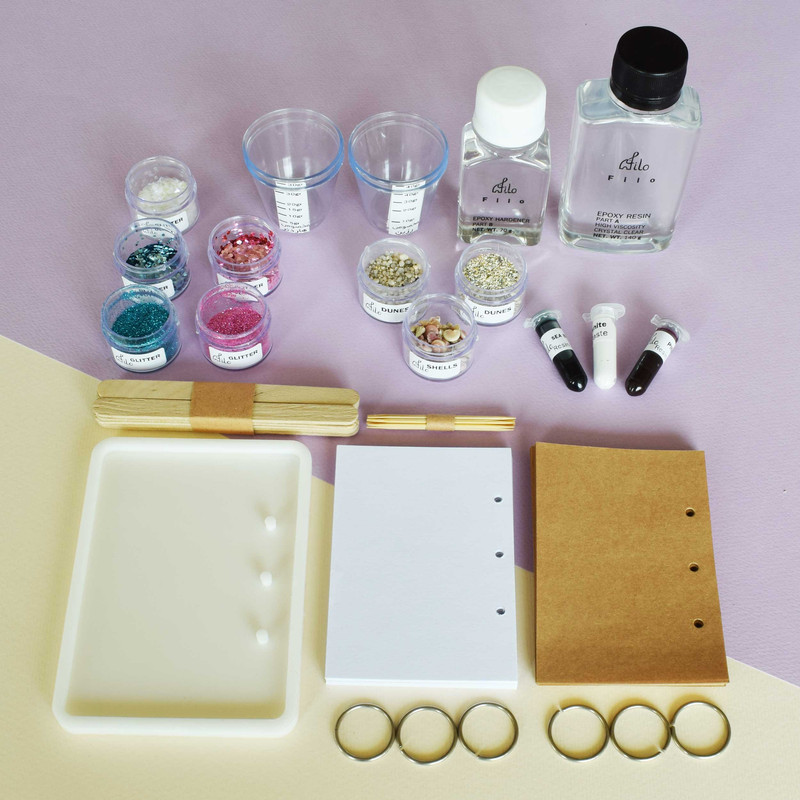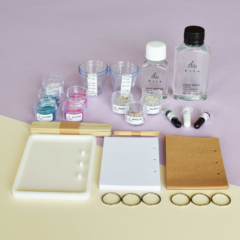 بسته کار با رزین فیلو باکس مدل دفترچه رزینی یک مجموعه کامل برای افرادی است که تا به حال تجربه کار با رزین اپوکسی را نداشته اند. محتویات داخل بسته بندی برای ساخت حداقل 2 دفترچه زیبا و جذاب رزینی با ابعاد 8.5x12 کافی است. با توجه به اینکه تمام وسایل با حجم متناسب با هم در این مجموعه قرار گرفته اند، شما با خرید این بسته اقتصادی بدون نیاز به هیچ ابزار اضافه و آموزش اولیه ای می توانید کار جذاب با رزین اپوکسی را تجربه کنید. این مجموع شامل یک بروشور آموزشی برای یادگیری اصول اولیه کار با رزین اپوکسی برای کسانی است که تا به حال از رزین استفاده نکرده اند. همچنین شما می توانید با اسکن QR کد موجود در بسته بندی محصول توسط موبایل خود به ویدیو آموزشی این بسته کار با رزین دسترسی پیدا کنید. رزین و هاردنر 180 گرمی موجود در این بسته از نوع غلیظ کاملا شفاف بوده و از کیفیت بسیار زیادی برخوردار است. این بسته شامل یک قالب سیلیکونی جلد دفترچه A7 بسیار با کیفیت است که پس از پایان یافتن رزین داخل بسته با خرید جداگانه رزین همچنان قابل استفاده خواهد بود. همچنین دو بسته کاغذ به رنگهای سفید و کاهی و حلقه های دفترچه، 2 رنگ خمیری بسیار با کیفیت، یک رنگ ترنسپرنت، پنج رنگ اکلیل، ورق طلا از دیگر محتویات این بسته است.همچنین پیمانه های مدرج شده مخصوص کار با رزین اپوکسی، چوب بستنی برای مخلوط کردن، خلال چوبی برای استفاده از رنگها و لیوان یک بار مصرف موجود در این مجموعه شما را از تهیه هر گونه وسیله اضافه برای کار با این بسته کاملا بی نیاز خواهد کرد.