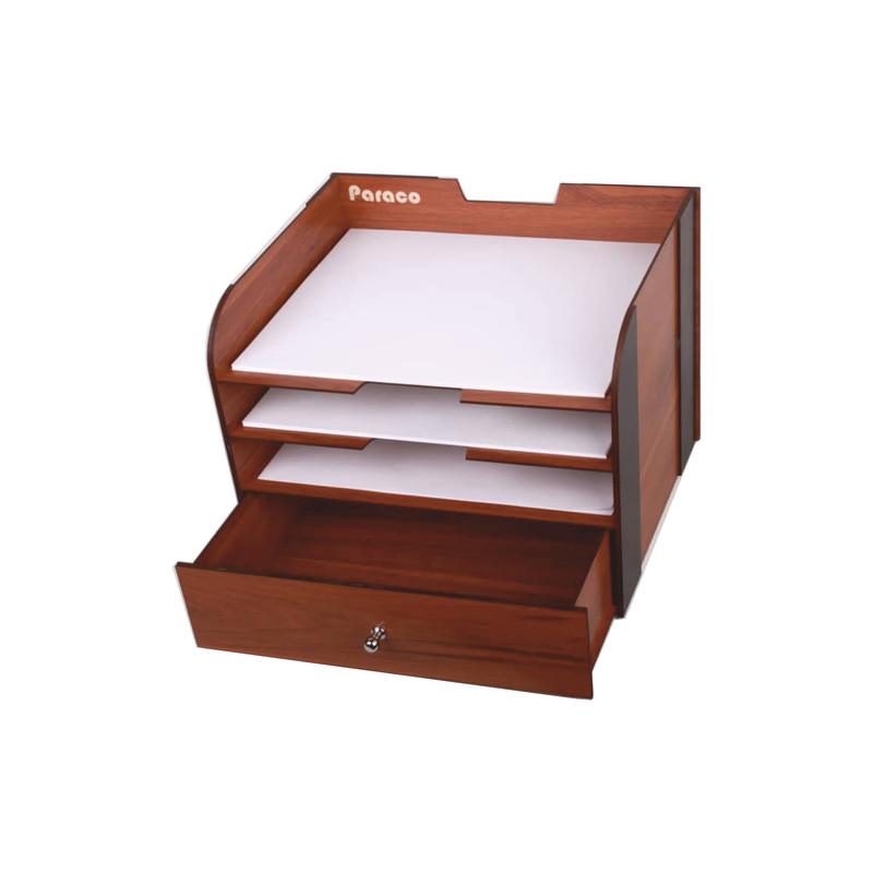 کازیه اداری کشو دار مدل پاراکو با طراحی هوشمندانه و خلاقانه کمک بزرگی به نظم بخشی اوراق و اسناد اداری و در نتیجه آن جلوگیری از سردرگمی افراد می کند اگر شما کارمند باشید، بر روی میزتان یک کازیه هم دارید و یا حداقل این محصول پرکاربرد را بر روی میز ادارات مشاهده کرده اید. همین طراحی خلاقانه باعث شده است تا حمل و جابجایی این محصول به آسانی میسر شود این محصول دارای سه طبقه شیار به همراه یک کشو میباشد با وجود اینکه این محصول از تخته فیبر 3 میلیمتری ساخته شده اما به دلیل استحکامی که پس از چفت شدن صفحات به وجود می آید، مقاومت کلی آن در برابر وزن و فشار کاملا قابل قبول است.
