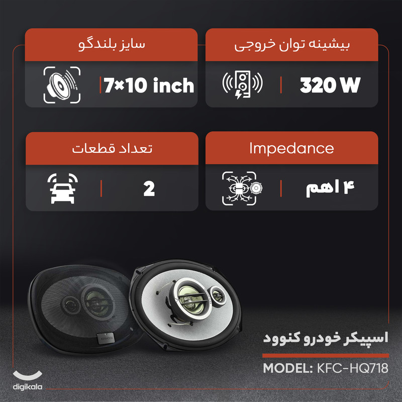 اسپیکر خودرو کنوود مدل KFC-HQ718 با طراحی بیضیشکل و عملکرد سهجهته، گزینهای عالی برای ارتقاء کیفیت سیستم صوتی انواع خودروهای سواری، شاسیبلند، ون و خودروهای تجاری است. این اسپیکر با نصب آسان و کیفیت صدای ارتقایافته، انتخابی مناسب برای کاربرانی است که به دنبال وضوح و بیس قدرتمند در خودرو هستند.