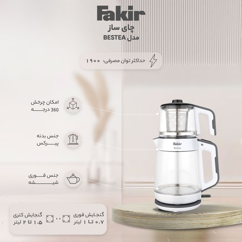 چای ساز فکر مدل Bestea شامل یک کتری پیرکس با ظرفیت 2 لیتر و یک قوری شیشهای یک لیتری است. فیلتر قوری از جنس استیل ضدزنگ است. دسته پلاستیکی کتری و قوری عایق گرما است و پس از به جوش آمدن آب، داغ نخواهند شد و نگران سوختگی نخواهید بود. این کتری برقی دارای المنتی از جنس استیل ضد زنگ است با حداکثر توان 1900 وات کار میکند.