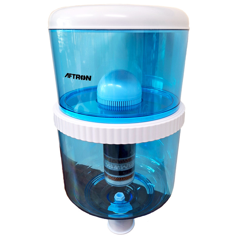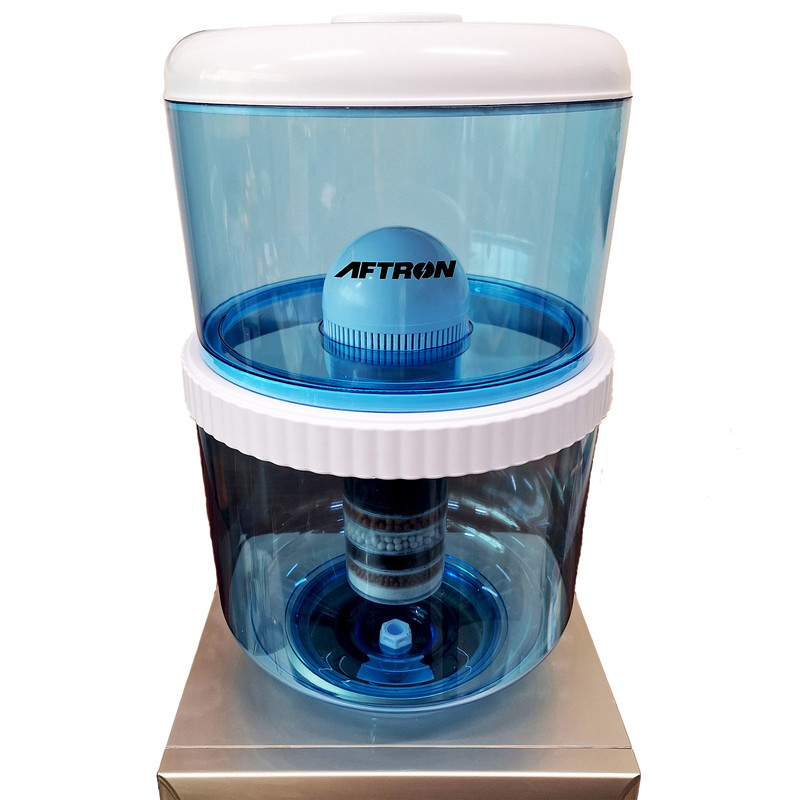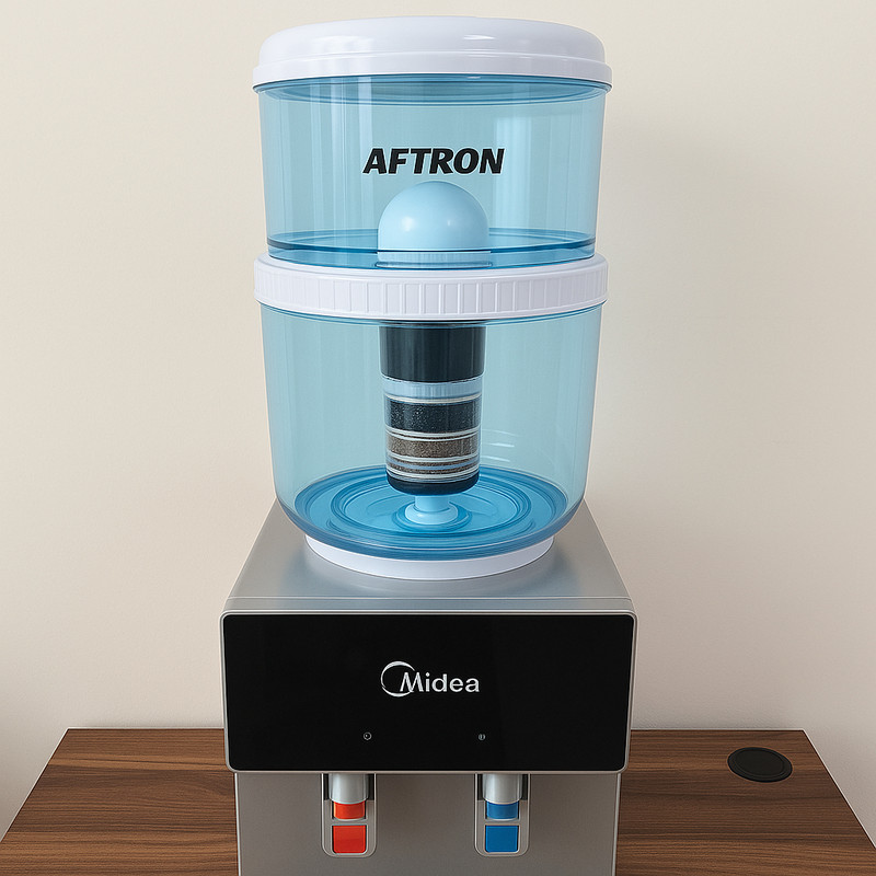 مخزن فیلتردار افترون مناسب انواع آبسردکن سرد و گرم چینی و کره ای می باشد. نام افترون یک برند معتبر و نام آشنایی ست که سالهاست آبسردکن هایش در سراسر ایران در جاهای مختلف استفاده می شود و در میان کاربران به برندی با کیفیت ساخت مقاوم و بادوام شهرت دارد.این مخزن دارای فیلتر کارتریج استوانه ای با فیلتراسیون 6 لایه ای می باشد؛ که جهت حذف بو و طعم اضافی آب ، حذف کدر بودن و کمک به شفاف شدن آب ، اضافه نمودن مواد معدنی و جذب ذرات ریز معلق در آب توسط فیلتر سرامیکی و جذب زنگ آب و سنک ریزه توسط فیلتر الیافی سفید داخل گنبدی پلاستیکی می باشد.این منبع قابل نصب بر روی تمامی آبسردکنهای چینی ، کره ای و مونتاژ ایران به جز آبسردکن مجیک مدل 8900 و 9900 می باشد.همچنین جهت ست کردن برند افترون ، پیشنهاد می شود؛ این مخزن را با آبسردکن کره ای افترون می توان استفاده نمود. ظرفیت این مخزن 20 لیتر می باشد. این مخزن دارای شناور مدل لیوانی از نوع مهره دار می باشد.کافیست پس از نصب مخزن بر روی انواع آبسردکن درب آن را براحتی برداشته و با یک پارچ مناسب آب مخزن را شارژ کنید؛ و در نهایت آب تصفیه شده گوارا ، از خروجی شیر آبسردکن برداشت نمائید.فیلتر این مخزن بطور تقریبی هر 12 ماه می بایست تعویض گردد؛ که خوشبختانه در سایت دیجی کالا موجود و قابل خرید می باشد.