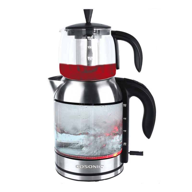 چایی ساز با سیستم دم آوری با بخار، توان مصرفی 2200 وات، گنجایش کتری 2 لیتر، گنجایش قوری 1 لیتر، چرخش 360 درجه بر روی پایه، سیستم گرم نگه دارنده، صافی داخل قوری تمام استیل