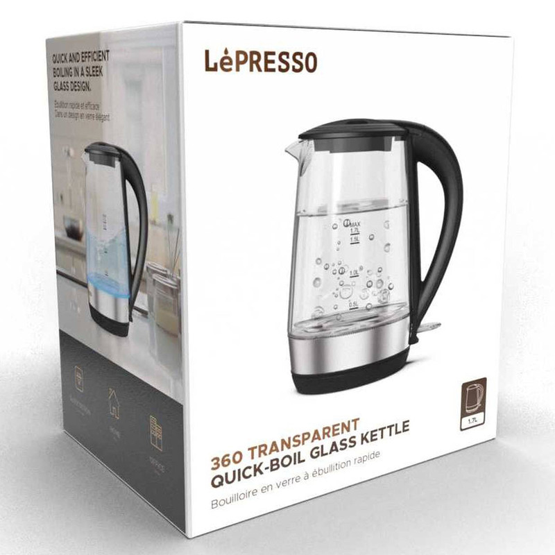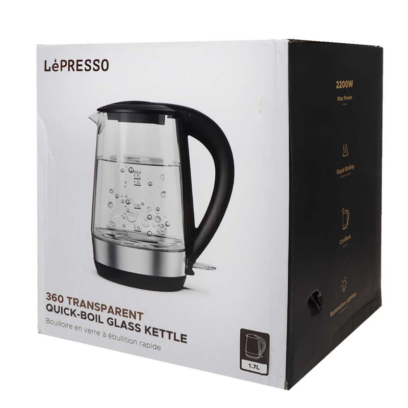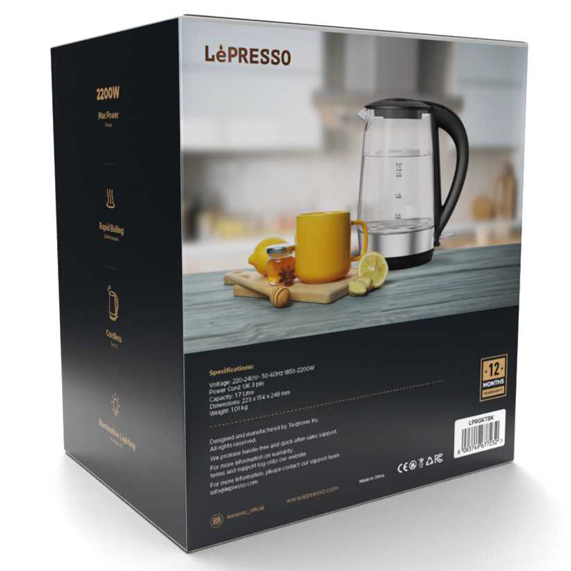 کتری برقی لپرسو LPRGKTBK یک کتری برقی بسیار با کیفیت و جذاب با بدنه شیشه ای است. با استفاده از این کتری می توانید آب را با سرعت بالایی جوش آورده و در وقت و مصرف انرژی صرفه جویی کنید. کتری برقی LePresso LPRGKTBK دارای یک چراغ LED بصری بوده که عملکرد کتری را در حین گرم کردن آب نمایش داده خواهد شد. توان کتری برقی LePresso LPRGKTBK بین 1850 تا 2200 وات است و می تواند آب در دمای 20 درجه سانتی گراد را در کمتر از 4 دقیقه تا 100 درجه سانتی گراد گرم کند. گنجایش ظرفیت کتری برقی لپرسو LPRGKTBK برابر با 1.7 لیتر است که می تواند برای یک خانواده 2 الی 5 نفره مناسب و کاربردی باشد. همچنین به لطف توان بالای کتری برقی LePresso LPRGKTBK می تواند در کمترین زمان آب را به جوش آورد و باعث شده مدت زمان کمتری صرف جوش آوردن آب شود. کتری برقی LePresso LPRGKTBK دارای پایه چرخشی 360 درجه می باشد به شما این امکان را میدهد تا در هر حالتی بتوانید کتری را بر روی استند قرار دهید. همچنین این قابلیت باعث بالا رفتن امنیت هم میشود چرا که در برخی مواقع برای ما امکان گذاشتن کتری بر روی استند در یک حالت مشخص وجود ندارد در نتیجه با وجود قابلیت 360 درجه، میتوانیم در هر حالتی که هستیم، کتری را بر روی استند بگذاریم. به منظور اطمینان بیشتر و تامین ایمنی، کتری برقی LePresso LPRGKTBK از قابلیت خاموش شدن خودکار پشتیبانی می کند و باعث می شود که در مواقعی که فراموش کرده اید دستگاه را خاموش کنید یا از برق بکشید از خطرات احتمالی جلوگیری کند. این سیستم به طور خودکار در صورت تمام شدن آب داخل کتری، کتری را خاموش می کند در نتیجه نگران آسیب های الکتریکی مانند آسیب داخلی یا آتش سوزی ناگهانی که در این مواقع ممکن است رخ دهد، نباشید.
