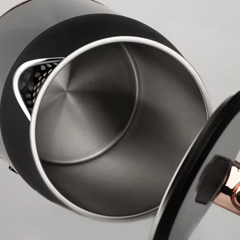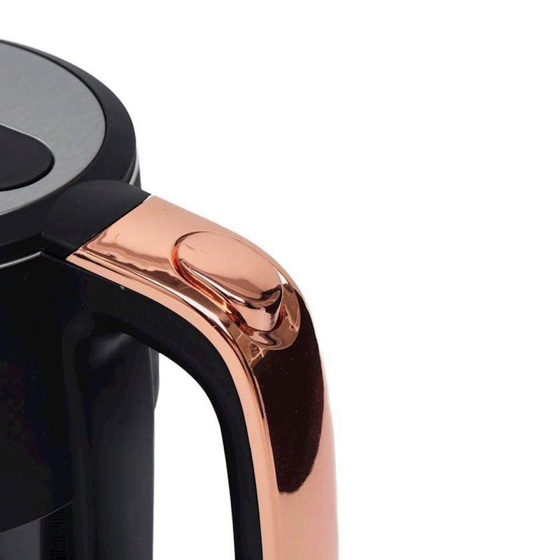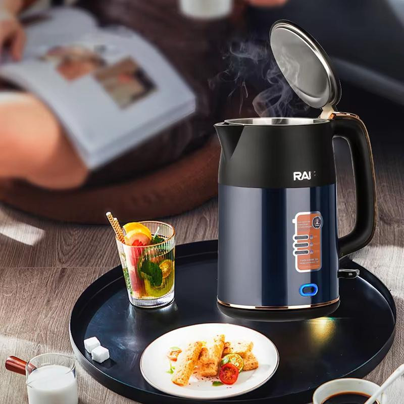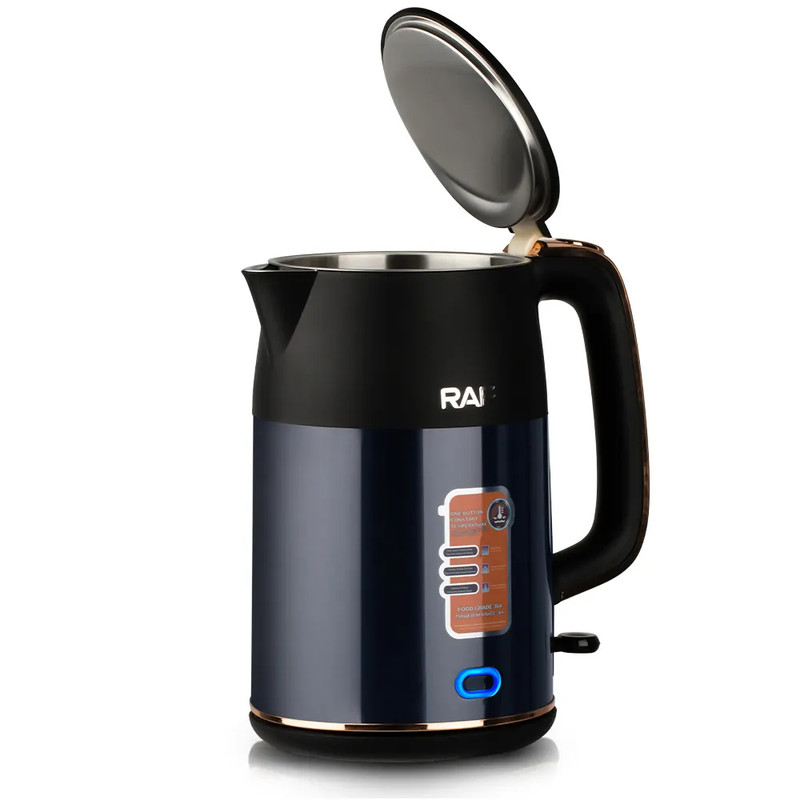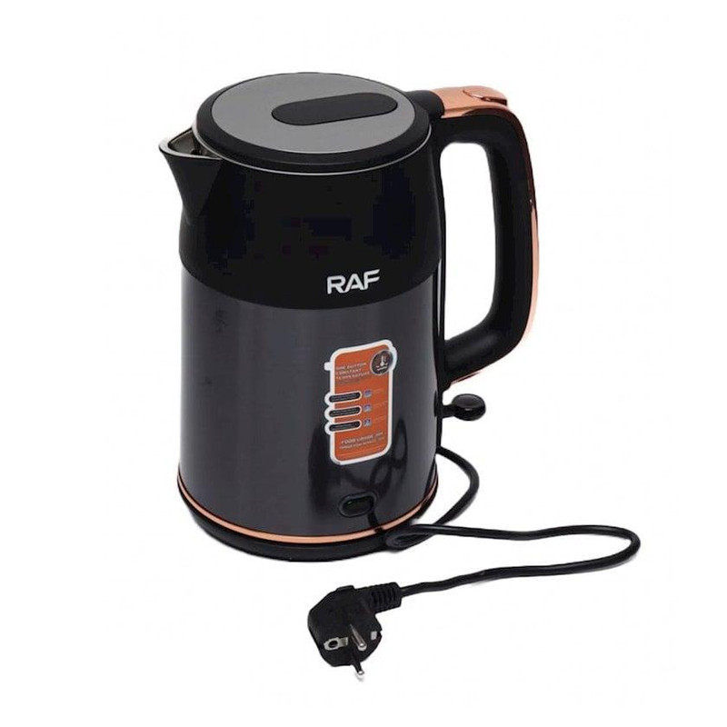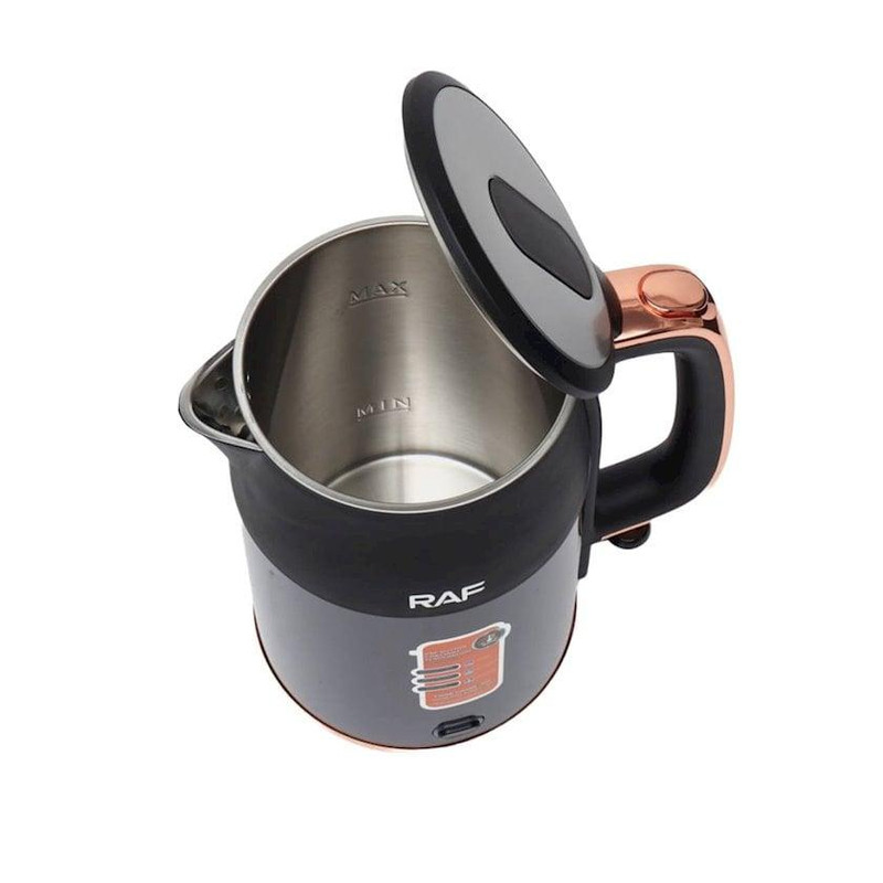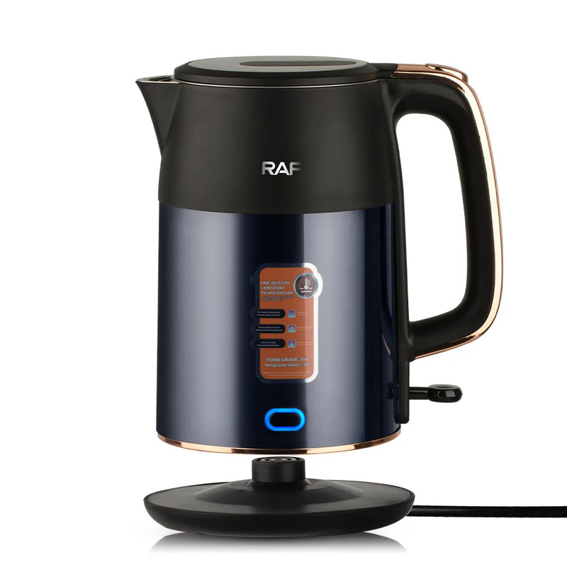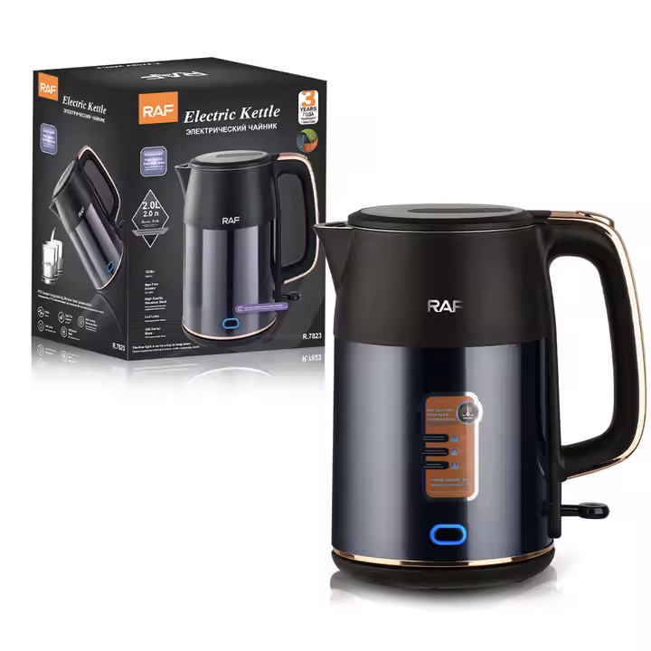 کتری برقی راف مدل R.7823 دارای بدنه دوجداره استیل و حجم 2لیتری هست و این کتری برقی دارای دکمه گرم نگهدارنده (keep warm) هست که در صورت احتیاج می تواند آب را گرم نگه دارد و از لحاظ ظاهری بسیار زیبا هست.